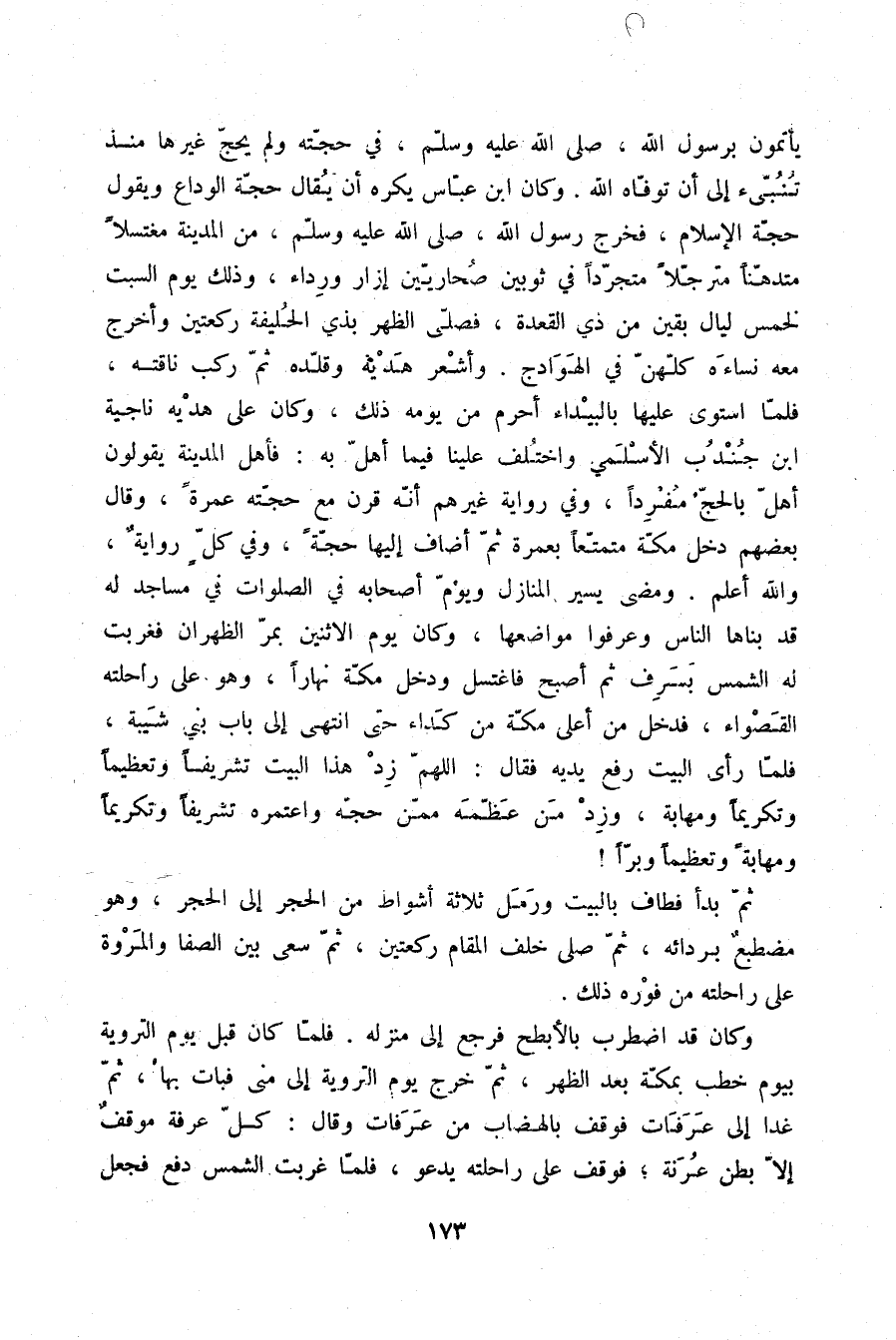 يَأْتَمُّونَ بِرَسُولِ اللَّهِ صلّى الله عليه وسلم فِي حَجَّتِهِ وَلَمْ يَحُجَّ غَيْرَهَا مُنْذُ تُنُبئَ إِلَى أَنْ تَوَفَّاهُ اللَّهُ , وَكَانَ ابْنُ عَبَّاسٍ يَكْرَهُ أَنْ يُقَالَ حَجَّةُ الْوَدَاعِ وَيَقُولُ حَجَّةُ الْإِسْلَامِ , فَخَرَجَ رَسُولُ اللَّهِ صلّى الله عليه وسلم مِنَ الْمَدِينَةِ مُغْتَسِلًا مُتَدَهِّنًا مُتَرَجِّلًا مُتَجَرِّدًا فِي ثَوْبَيْنِ صُحَارِيَّيْنِ إِزَارٌ , وَرِدَاءٌ , وَذَلِكَ يَوْمُ السَّبْتِ لِخَمْسِ لَيَالٍ بَقِينَ مِنْ ذِي الْقَعْدَةِ فَصَلَّى الظُّهْرَ بِذِي الْحُلَيْفَةِ رَكْعَتَيْنِ وَأَخْرَجَ مَعَهُ نِسَاءَهُ كُلَّهُنَّ فِي الْهَوَادِجِ، وَأَشْعَرَ هَدْيَهُ وَقَلَّدَهُ ثُمَّ رَكِبَ نَاقَتَهُ , فَلَمَّا اسْتَوَى عَلَيْهَا بِالْبَيْدَاءِ أَحْرَمَ مِنْ يَوْمِهِ ذَلِكَ وَكَانَ عَلَى هَدْيِهِ نَاجِيَةُ بْنُ جُنْدُبٍ الْأَسْلَمَيُّ , وَاخْتُلِفَ عَلَيْنَا فِيمَا أَهَلَّ بِهِ فَأَهْلُ الْمَدِينَةِ، يَقُولُونَ: أَهَلَّ بِالْحَجِّ مُفْرِدًا , وَفِي رِوَايَةِ غَيْرِهِمْ أَنَّهُ قَرَنَ مَعَ حَجَّتِهِ عُمْرَةً وَقَالَ: بَعْضُهُمْ دَخَلَ مَكَّةَ مُتَمَتِّعًا بِعُمْرَةٍ ثُمَّ أَضَافَ إِلَيْهَا حَجَّةً , وَفِي كُلٍّ رِوَايَةٌ , وَاللَّهُ أَعْلَمُ. وَمَضَى يَسِيرُ الْمَنَازِلَ وَيَؤُمُّ أَصْحَابَهُ فِي الصَّلَوَاتِ فِي مَسَاجِدَ لَهُ قَدْ بَنَاهَا النَّاسُ وَعَرَفُوا مَوَاضِعَهَا وَكَانَ يَوْمُ الِاثْنَيْنِ بِمَرِّ الظَّهْرَانِ فَغَرَبَتْ لَهُ الشَّمْسُ بِسَرِفٍ ثُمَّ أَصْبَحَ فَاغْتَسَلَ وَدَخَلَ مَكَّةَ نَهَارًا وَهُوَ عَلَى رَاحِلَتِهِ الْقَصْوَاءِ , فَدَخَلَ مِنْ أَعْلَى مَكَّةَ مِنْ كَدَاءٍ حَتَّى انْتَهَى إِلَى بَابِ بَنِي شَيْبَةَ , فَلَمَّا رَأَى الْبَيْتَ رَفَعَ يَدَيْهِ فَقَالَ: «اللَّهُمَّ زِدْ هَذَا الْبَيْتَ تَشْرِيفًا وَتَعْظِيمًا وَتَكْرِيمًا وَمَهَابَةً , وَزِدْ مَنْ عَظَّمَهُ مِمَّنْ حَجَّهُ وَاعْتَمَرَهُ تَشْرِيفًا وَتَكْرِيمًا وَمَهَابَةً وَتَعْظِيمًا وَبِرًا» ثُمَّ بَدَأَ فَطَافَ بِالْبَيْتِ وَرَمَلَ ثَلَاثَةَ أَشْوَاطٍ مِنَ الْحَجَرِ إِلَى الْحَجَرِ وَهُوَ مُضْطَبِعٌ بِرِدَائِهِ , ثُمَّ صَلَّى خَلْفَ الْمَقَامِ رَكْعَتَيْنِ ثُمَّ سَعَى بَيْنَ الصَّفَا وَالْمَرْوَةِ عَلَى رَاحِلَتِهِ مِنْ فَوْرِهِ ذَلِكَ. وَكَانَ قَدِ اضْطَرَبَ بِالْأَبْطَحِ فَرَجَعَ إِلَى مَنْزِلِهِ. فَلَمَّا كَانَ قَبْلَ يَوْمِ التَّرْوِيَةَ بِيَوْمٍ خَطَبَ بِمَكَّةَ بَعْدَ الظُّهْرِ ثُمَّ خَرَجَ يَوْمَ التَّرْوِيَةَ إِلَى مِنًى فَبَاتَ بِهَا ثُمَّ غَدَا إِلَى عَرَفَاتٍ فَوَقَفَ بِالْهِضَابِ مِنْ عَرَفَاتٍ، وَقَالَ: «كُلُّ عَرَفَةَ مَوْقِفٌ إِلَّا بَطْنَ عُرَنَةَ» ؛ فَوَقَفَ عَلَى رَاحِلَتِهِ يَدْعُو فَلَمَّا غَرَبَتِ الشَّمْسُ دَفَعَ فَجَعَلَ