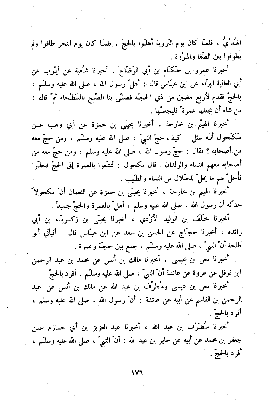 أَخْبَرَنَا مُطَرِّفُ بْنُ عَبْدِ اللَّهِ، أَخْبَرَنَا عَبْدُ الْعَزِيزِ بْنُ أَبِي حَازِمٍ، عَنْ جَعْفَرِ بْنِ مُحَمَّدٍ، عَنْ أَبِيهِ، عَنْ جَابِرِ بْنِ عَبْدِ اللَّهِ: «§أَنَّ النَّبِيَّ صلّى الله عليه وسلم أَفْرَدَ بِالْحَجِّ»