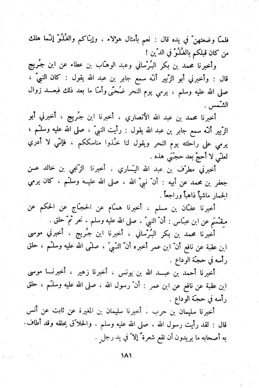 أَخْبَرَنَا مُحَمَّدُ بْنُ بَكْرٍ الْبُرْسَانِيُّ، أَخْبَرَنَا ابْنُ جُرَيْجٍ، أَخْبَرَنِي مُوسَى بْنُ عُقْبَةَ، عَنْ نَافِعٍ، أَنَّ ابْنَ عُمَرَ، أَخْبَرَهُ: «§أَنَّ النَّبِيَّ صلّى الله عليه وسلم حَلَقَ رَأْسَهُ فِي حَجَّةِ الْوَدَاعِ»