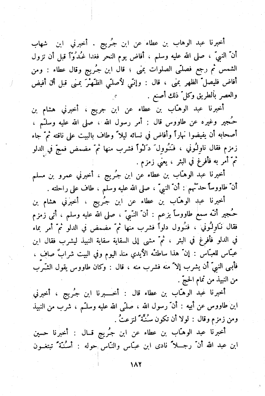 أَخْبَرَنَا عَبْدُ الْوَهَّابِ بْنُ عَطَاءٍ، عَنِ ابْنِ جُرَيْجٍ، قَالَ: أَخْبَرَنَا حُسَيْنُ بْنُ عَبْدِ اللَّهِ، أَنَّ رَجُلًا، نَادَى ابْنَ عَبَّاسٍ وَالنَّاسُ حَوْلَهُ: أَسُنَّةً تَبْتَغُونَ -[183]- بِهَذَا النَّبِيذِ أَمْ هُوَ أَهْوَنُ عَلَيْكُمْ مِنَ الْعَسَلِ وَاللَّبَنِ؟ فَقَالَ ابْنُ عَبَّاسٍ: §أُتِيَ النَّبِيُّ صلّى الله عليه وسلم وَمَعَهُ أَصْحَابُهُ مِنَ الْمُهَاجِرِينَ وَالْأَنْصَارِ بِعِسَاسٍ فِيهَا النَّبِيذُ فَلَمَّا شَرِبَ صلّى الله عليه وسلم، عَجِلَ قَبْلَ أَنْ يُرْوَى فَرَفَعَ رَأْسَهُ فَقَالَ: «أَحْسَنْتُمْ هَكَذَا اصْنَعُوا» قَالَ ابْنُ عَبَّاسٍ: فَرِضَاءُ رَسُولِ اللَّهِ صلّى الله عليه وسلم، فِي ذَلِكَ أَحَبُّ إِلَيَّ مِنْ أَنْ تَسِيلَ شِعَابُهَا عَلَيْنَا عَسَلًا وَلَبَنًا