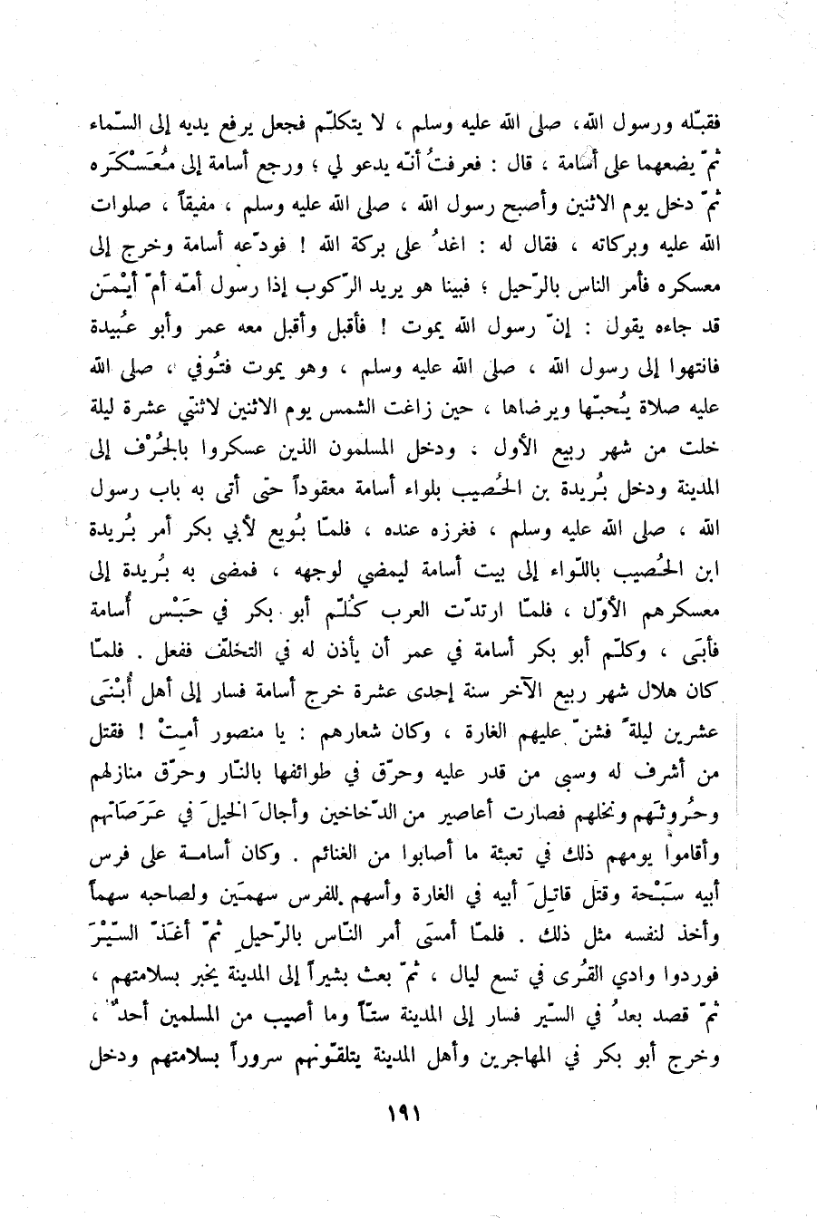 فَقَبَّلَهُ وَرَسُولُ اللَّهِ صلّى الله عليه وسلم لَا يَتَكَلَّمُ فَجَعَلَ يَرْفَعُ يَدَيْهِ إِلَى السَّمَاءِ ثُمَّ يَضَعُهُمَا عَلَى أُسَامَةَ قَالَ: فَعَرَفْتُ أَنَّهُ يَدْعُو لِيَ وَرَجَعَ أُسَامَةُ إِلَى مُعَسْكَرِهِ ثُمَّ دَخَلَ يَوْمُ الِاثْنَيْنِ وَأَصْبَحَ رَسُولُ اللَّهِ صلّى الله عليه وسلم، مُفِيقًا صَلَوَاتُ اللَّهِ عَلَيْهِ وَبَرَكَاتُهُ فَقَالَ لَهُ: اغْدُ عَلَى بَرَكَةِ اللَّهِ فَوَدَّعَهُ أُسَامَةُ وَخَرَجَ إِلَى مُعَسْكَرِهِ فَأَمَرَ النَّاسَ بِالرَّحِيلِ؛ فَبَيْنَا هُوَ يُرِيدُ الرُّكُوبَ إِذَا رَسُولُ أُمِّهِ أُمِّ أَيْمَنَ قَدْ جَاءَهُ يَقُولُ: إِنَّ رَسُولَ اللَّهِ يَمُوتُ فَأَقْبَلَ وَأَقْبَلَ مَعَهُ عُمَرُ وَأَبُو عُبَيْدَةَ فَانْتَهَوْا إِلَى رَسُولِ اللَّهِ صلّى الله عليه وسلم وَهُوَ يَمُوتُ فَتُوُفِّيَ، صلّى الله عليه وسلم صَلَاةً يُحِبُّهَا وَيَرْضَاهَا حِينَ زَاغَتِ الشَّمْسُ يَوْمَ الِاثْنَيْنِ لِاثْنَتَيْ عَشْرَةَ لَيْلَةٍ خَلَتْ مِنْ شَهْرِ رَبِيعٍ الْأَوَّلِ، وَدَخَلَ الْمُسْلِمُونَ الَّذِينَ عَسْكَرُوا بِالْجُرْفِ إِلَى الْمَدِينَةِ وَدَخَلَ بُرَيْدَةُ بْنُ الْحُصَيْبِ بِلِوَاءِ أُسَامَةَ مَعْقُودًا حَتَّى أَتَى بِهِ بَابَ رَسُولِ اللَّهِ صلّى الله عليه وسلم فَغَرَزَهُ عِنْدَهُ، فَلَمَّا بُويِعَ لِأَبِي بَكْرٍ أَمَرَ بُرَيْدَةَ بْنَ الْحُصَيْبِ بِاللِّوَاءِ إِلَى بَيْتِ أُسَامَةَ لِيُمْضِيَ لِوَجْهِهِ فَمَضَى بِهِ بُرَيْدَةُ إِلَى مُعَسْكَرِهِمُ الْأَوَّلِ، فَلَمَّا ارْتَدَّتِ الْعَرَبُ كُلِّمَ أَبُو بَكْرٍ فِي حَبْسِ أُسَامَةَ فَأَبَى، وَكَلَّمَ أَبُو بَكْرٍ أُسَامَةَ فِي عُمَرَ أَنْ يَأْذَنَ لَهُ فِي التَّخَلُّفِ فَفَعَلَ فَلَمَّا كَانَ هِلَالُ شَهْرِ رَبِيعٍ الْآخِرِ سَنَةَ إِحْدَى عَشْرَةَ خَرَجَ أُسَامَةُ فَسَارَ إِلَى أَهْلِ أُبْنَى عِشْرِينَ لَيْلَةٍ فَشَنَّ عَلَيْهِمُ الْغَارَةَ وَكَانَ شِعَارُهُمْ: يَا مَنْصُورُ أَمِتْ فَقَتَلَ مَنْ أَشْرَفَ لَهُ وَسَبَى مَنْ قَدَرَ عَلَيْهِ وَحَرَّقَ فِي طَوَائِفِهَا بِالنَّارِ وَحَرَّقَ مَنَازِلَهُمْ وَحُرُوثَهُمْ وَنَخْلَهُمْ فَصَارَتْ أَعَاصِيرُ مِنَ الدَّخَّاخِينَ وَأَجَالَ الْخَيْلَ فِي عَرَصَاتِهِمْ وَأَقَامُوا يَوْمَهُمْ ذَلِكَ فِي تَعْبِئَةِ مَا أَصَابُوا مِنَ الْغَنَائِمِ وَكَانَ أُسَامَةُ عَلَى فَرَسِ أَبِيهِ سُبْحَةَ وَقَتْلَ قَاتِلَ أَبِيهِ فِي الْغَارَةِ وَأَسْهَمَ لِلْفَرَسِ سَهْمَيْنِ وَلِصَاحِبِهِ سَهْمًا وَأَخَذَ لِنَفْسِهِ مِثْلَ ذَلِكَ فَلَمَّا أَمْسَى أَمَرَ النَّاسَ بِالرَّحِيلِ ثُمَّ أَغَذَّ السَّيْرَ فَوَرَدُوا وَادِيَ الْقُرَى فِي تِسْعِ لَيَالٍ ثُمَّ بَعَثَ بَشِيرًا إِلَى الْمَدِينَةِ يُخْبِرُ بِسَلَامَتِهِمْ، ثُمَّ قَصَدَ بَعْدُ فِي السَّيْرِ فَسَارَ إِلَى الْمَدِينَةِ سِتًّا وَمَا أُصِيبَ مِنَ الْمُسْلِمِينَ أَحَدٌ وَخَرَجَ أَبُو بَكْرٍ فِي الْمُهَاجِرِينَ وَأَهْلُ الْمَدِينَةِ يَتَلَقَّوْنَهُمْ سُرُورًا بِسَلَامَتِهِمْ وَدَخَلَ