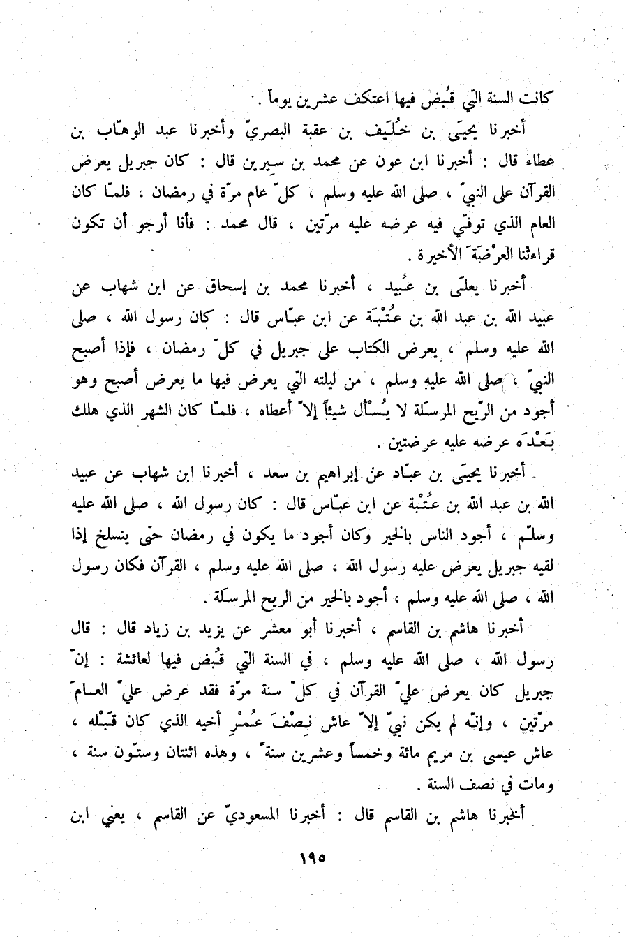 أَخْبَرَنَا يَحْيَى بْنُ خُلَيْفِ بْنِ عُقْبَةَ الْبَصْرِيُّ، وَأَخْبَرَنَا عَبْدُ الْوَهَّابِ بْنُ عَطَاءٍ، قَالَ: أَخْبَرَنَا ابْنُ عَوْنٍ، عَنْ مُحَمَّدِ بْنِ سِيرِينَ، قَالَ: «كَانَ جِبْرِيلُ §يَعْرِضُ الْقُرْآنَ عَلَى النَّبِيِّ صلّى الله عليه وسلم كُلَّ عَامٍ مَرَّةً فِي رَمَضَانَ، فَلَمَّا كَانَ الْعَامُ الَّذِي تُوُفِّيَ فِيهِ عَرَضَهُ عَلَيْهِ مَرَّتَيْنِ» . قَالَ مُحَمَّدٌ: فَأَنَا أَرْجُو أَنْ تَكُونَ قِرَاءَتُنَا الْعَرْضَةَ الْأَخِيرَةَ
