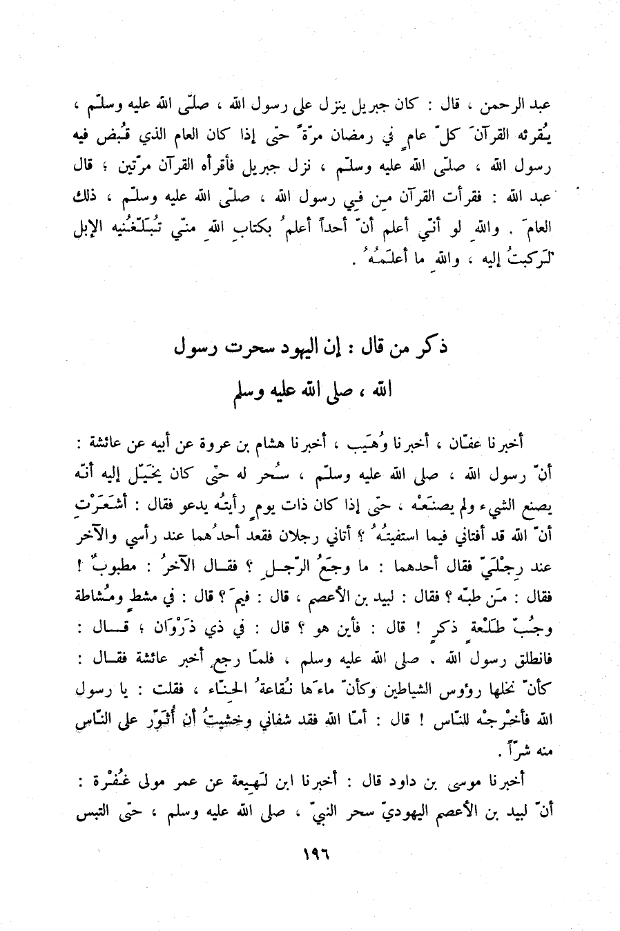 أَخْبَرَنَا مُوسَى بْنُ دَاوُدَ، قَالَ: أَخْبَرَنَا ابْنُ لَهِيعَةَ عَنْ عُمَرَ مَوْلَى غُفْرَةَ: «أَنَّ لَبِيدَ بْنَ الْأَعْصَمِ الْيَهُودِيَّ سَحَرَ النَّبِيَّ صلّى الله عليه وسلم حَتَّى الْتَبَسَ -[197]- بَصَرُهُ، وَعَادَهُ أَصْحَابُهُ، ثُمَّ إِنَّ جِبْرِيلَ عَلَيْهِ السَّلَامُ وَمِيكَائِيلَ أَخْبَرَاهُ، §فَأَخَذَهُ النَّبِيُّ صلّى الله عليه وسلم، فَاعْتَرَفَ فَاسْتَخْرَجَ السِّحْرَ مِنَ الْجُبِّ مِنْ تَحْتِ الْبِئْرِ، ثُمَّ نَزَعَهُ فَحَلَّهُ، فَكُشِفَ عَنْ رَسُولِ اللَّهِ صلّى الله عليه وسلم، وَعَفَا عَنْهُ»