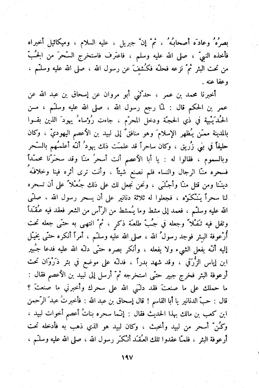أَخْبَرَنَا مُحَمَّدُ بْنُ عُمَرَ، حَدَّثَنِي أَبُو مَرْوَانَ، عَنْ إِسْحَاقَ بْنِ عَبْدِ اللَّهِ، عَنْ عُمَرَ بْنِ الْحَكَمِ، قَالَ: " لَمَّا رَجَعَ رَسُولُ اللَّهِ صلّى الله عليه وسلم مِنَ الْحُدَيْبِيَةِ فِي ذِي الْحِجَّةِ وَدَخَلَ الْمُحَرَّمُ جَاءَتْ رُؤَسَاءُ يَهُودَ الَّذِينَ بَقُوا بِالْمَدِينَةِ مِمَّنْ يُظْهِرُ الْإِسْلَامَ وَهُوَ مُنَافِقٌ إِلَى لَبِيدِ بْنِ الْأَعْصَمِ الْيَهُودِيِّ وَكَانَ حَلِيفًا فِي بَنِي زُرَيْقٍ، وَكَانَ سَاحِرًا، قَدْ عَلِمَتْ ذَلِكَ يَهُودُ أَنَّهُ أَعْلَمُهُمْ بِالسِّحْرِ وَبِالسَّمُومِ، فَقَالُوا لَهُ: يَا أَبَا الْأَعْصَمِ، أَنْتَ أَسْحَرُ مِنَّا، وَقَدْ سَحَرْنَا مُحَمَّدًا فَسَحَرَهُ مِنَّا الرِّجَالُ وَالنِّسَاءُ فَلَمْ نَصْنَعْ شَيْئًا، وَأَنْتَ تَرَى أَثَرَهُ فِينَا، وَخِلَافَهُ دِينَنَا، وَمَنْ قَتَلَ مِنَّا وَأَجْلَى، وَنَحْنُ نَجْعَلُ لَكَ عَلَى ذَلِكَ جُعْلًا عَلَى أَنْ تَسْحَرَهُ لَنَا سِحْرًا يَنْكَؤُهُ، فَجَعَلُوا لَهُ ثَلَاثَةَ دَنَانِيرَ عَلَى أَنْ يَسْحَرَ رَسُولَ اللَّهِ صلّى الله عليه وسلم فَعَمَدَ إِلَى مُشْطٍ وَمَا يُمْشَطُ مِنَ الرَّأْسِ مِنَ الشَّعْرِ، فَعَقَدَ فِيهِ عُقَدًا، وَتَفِلَ فِيهِ تَفْلًا، وَجَعَلَهُ فِي جَبِّ طَلْعَةٍ ذَكَرٍ، ثُمَّ انْتَهَى بِهِ حَتَّى جَعَلَهُ تَحْتَ أُرْعُوفَةِ الْبِئْرِ، فَوَجَدَ رَسُولُ اللَّهِ صلّى الله عليه وسلم أَمْرًا أَنْكَرَهُ، حَتَّى يُخَيَّلُ إِلَيْهِ أَنَّهُ يَفْعَلُ الشَّيْءَ وَلَا يَفْعَلُهُ، وَأَنْكَرَ بَصَرَهُ حَتَّى دَلَّهُ اللَّهُ عَلَيْهِ فَدَعَا جُبَيْرَ بْنَ إِيَاسَ الزُّرَقِيَّ وَقَدْ شَهِدَ بَدْرًا فَدَلَّهُ عَلَى مَوْضِعٍ فِي بِئْرِ ذَرْوَانَ تَحْتَ أُرْعُوفَةِ الْبِئْرِ، فَخَرَجَ جُبَيْرٌ حَتَّى اسْتَخْرَجَهُ ثُمَّ أَرْسَلَ إِلَى لَبِيدِ بْنِ الْأَعْصَمِ فَقَالَ: «§مَا حَمَلَكَ عَلَى مَا صَنَعْتَ، فَقَدْ دَلَّنِي اللَّهُ عَلَى سِحْرِكَ، وَأَخْبَرَنِي مَا صَنَعْتَ» ، قَالَ: حُبُّ الدَّنَانِيرِ يَا أَبَا الْقَاسِمِ " قَالَ إِسْحَاقُ بْنُ عَبْدِ اللَّهِ: فَأَخْبَرْتُ عَبْدَ الرَّحْمَنِ بْنَ كَعْبِ بْنِ مَالِكٍ بِهَذَا الْحَدِيثِ فَقَالَ: إِنَّمَا سَحَرَهُ بَنَاتُ أَعْصَمَ أَخَوَاتُ لَبِيدٍ، وَكُنَّ أَسْحَرَ مِنْ لَبِيدٍ وَأَخْبَثَ، وَكَانَ لَبِيدٌ هُوَ الَّذِي ذَهَبَ بِهِ فَأَدْخَلَهُ تَحْتَ أُرْعُوفَةِ الْبِئْرِ فَلَمَّا عَقَدُوا تِلْكَ الْعَقَدَ أَنْكَرَ رَسُولُ اللَّهِ صلّى الله عليه وسلم