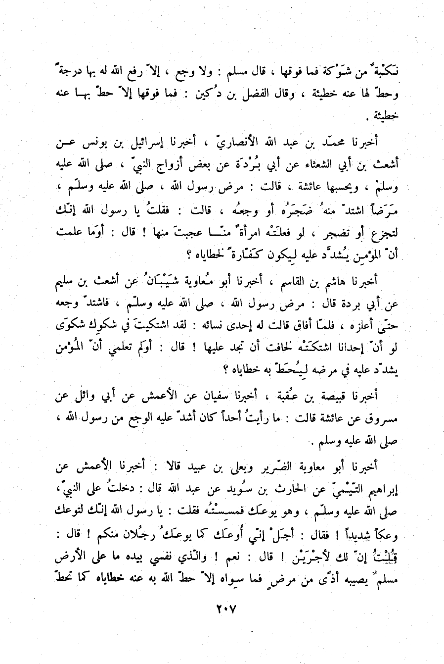 أَخْبَرَنَا أَبُو مُعَاوِيَةَ الضَّرِيرُ، وَيَعْلَى بْنُ عُبَيْدٍ، قَالَا: أَخْبَرَنَا الْأَعْمَشُ، عَنْ إِبْرَاهِيمَ التَّيْمِيِّ، عَنِ الْحَارِثِ بْنِ سُوَيْدٍ، عَنْ عَبْدِ اللَّهِ، قَالَ: دَخَلْتُ عَلَى النَّبِيِّ صلّى الله عليه وسلم وَهُوَ يُوعَكُ فَمَسِسْتُهُ فَقُلْتُ: يَا رَسُولَ اللَّهِ إِنَّكَ لَتُوعَكُ وَعْكًا شَدِيدًا فَقَالَ: «§أَجَلْ، إِنِّي أُوعَكُ كَمَا يُوعَكُ رَجُلَانِ مِنْكُمْ» قَالَ: قُلْتُ إِنَّ لَكَ لَأَجْرَيْنِ، قَالَ: «نَعَمْ وَالَّذِي نَفْسِي بِيَدِهِ، مَا عَلَى الْأَرْضِ مُسْلِمٌ يُصِيبُهُ أَذًى مِنْ مَرِضٍ فَمَا سِوَاهُ إِلَّا حَطَّ اللَّهُ بِهِ عَنْهُ خَطَايَاهُ، كَمَا تَحُطُّ -[208]- الشَّجَرَةُ وَرَقَهَا»