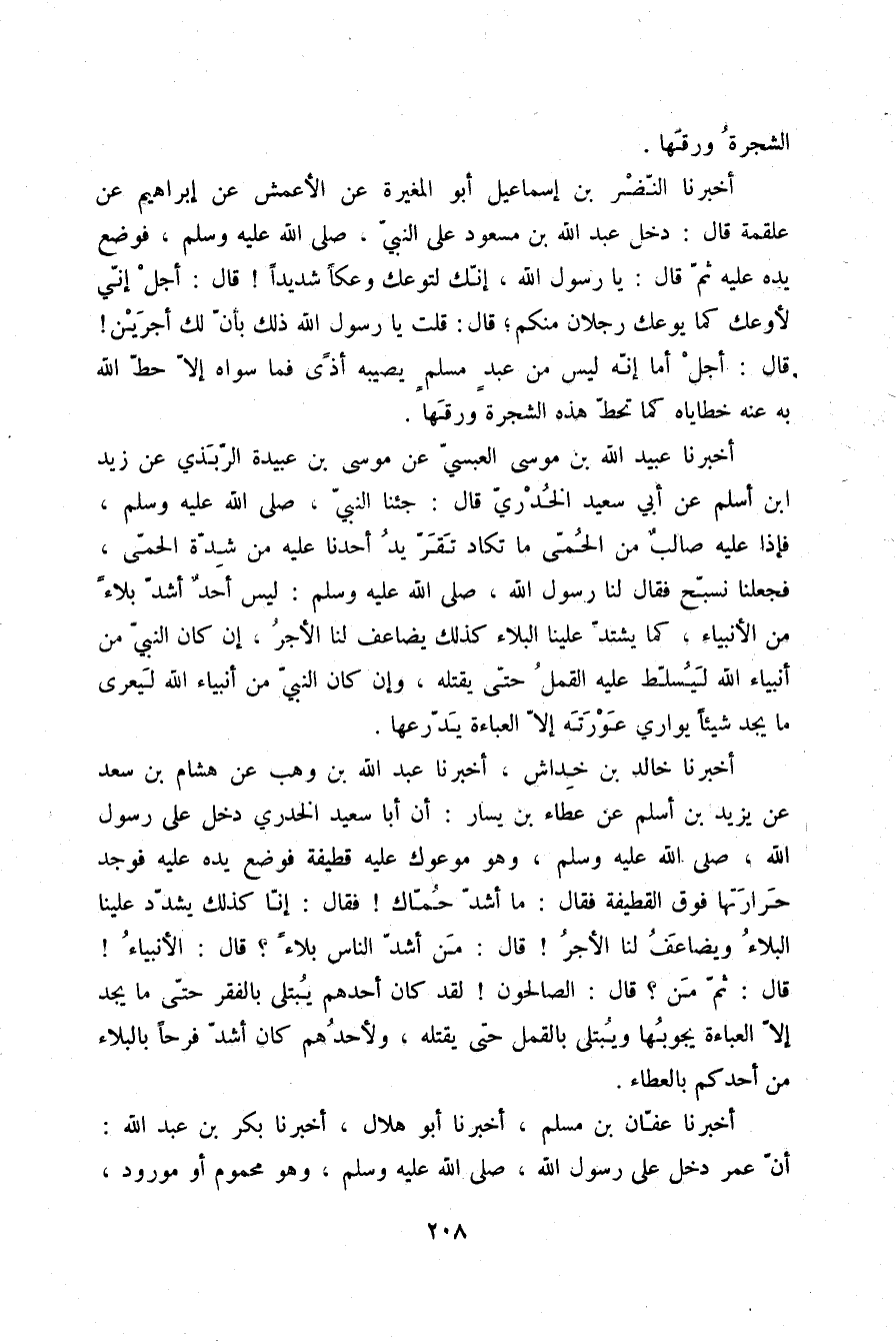 أَخْبَرَنَا النَّضْرُ بْنُ إِسْمَاعِيلَ أَبُو الْمُغِيرَةِ، عَنِ الْأَعْمَشِ، عَنْ إِبْرَاهِيمَ، عَنْ عَلْقَمَةَ، قَالَ: دَخَلَ عَبْدُ اللَّهِ بْنُ مَسْعُودٍ عَلَى النَّبِيِّ صلّى الله عليه وسلم فَوَضَعَ يَدَهُ عَلَيْهِ ثُمَّ قَالَ: يَا رَسُولَ اللَّهِ إِنَّكَ لَتُوعَكُ وَعْكًا شَدِيدًا، قَالَ: «§أَجَلْ، إِنِّي لَأُوعَكُ كَمَا يُوعَكُ رَجُلَانِ مِنْكُمْ» ، قَالَ: قُلْتُ: يَا رَسُولَ اللَّهِ، ذَلِكَ بِأَنَّ لَكَ أَجْرَيْنِ، قَالَ: «أَجَلْ، أَمَا إِنَّهُ لَيْسَ مِنْ عَبْدٍ مُسْلِمٍ يُصِيبُهُ أَذًى فَمَا سِوَاهُ إِلَّا حَطَّ اللَّهُ بِهِ عَنْهُ خَطَايَاهُ، كَمَا تَحُطُّ هَذِهِ الشَّجَرَةُ وَرَقَهَا»