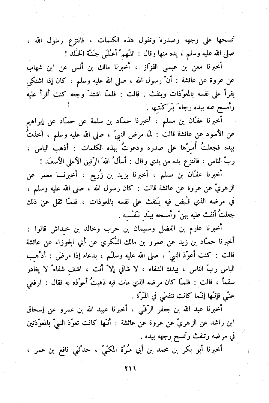 أَخْبَرَنَا عَفَّانُ بْنُ مُسْلِمٍ، أَخْبَرَنَا يَزِيدُ بْنُ زُرَيْعٍ، أَخْبَرَنَا مَعْمَرٌ، عَنِ الزُّهْرِيِّ، عَنْ عُرْوَةَ، عَنْ عَائِشَةَ، قَالَتْ: «كَانَ رَسُولُ اللَّهِ صلّى الله عليه وسلم فِي مَرَضِهِ الَّذِي قُبِضَ فِيهِ يَنْفُثُ عَلَى نَفْسِهِ بِالْمُعَوِّذَاتِ، §فَلَمَّا ثَقُلَ عَنْ ذَلِكَ جَعَلْتُ أَنْفُثُ عَلَيْهِ بِهِنَّ وَأَمْسَحُهُ بِيَدِ نَفْسِهِ»