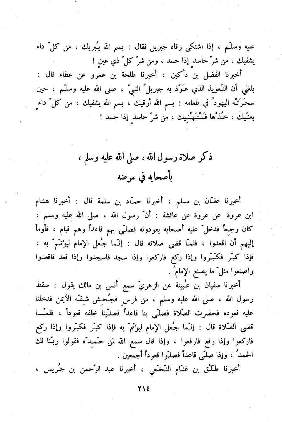 أَخْبَرَنَا عَفَّانُ بْنُ مُسْلِمٍ، أَخْبَرَنَا حَمَّادُ بْنُ سَلَمَةَ، قَالَ: أَخْبَرَنَا هِشَامُ بْنُ عُرْوَةَ، عَنْ عُرْوَةَ، عَنْ عَائِشَةَ، أَنَّ رَسُولَ اللَّهِ صلّى الله عليه وسلم كَانَ وَجِعًا فَدَخَلَ عَلَيْهِ أَصْحَابُهُ يَعُودُونَهُ فَصَلَّى بِهِمْ قَاعِدًا وَهُمْ قِيَامٌ فَأَوْمَأَ إِلَيْهِمْ أَنِ اقْعُدُوا فَلَمَّا قَضَى صَلَاتَهُ قَالَ: «§إِنَّمَا جُعِلَ الْإِمَامُ لِيُؤْتَمَّ بِهِ، فَإِذَا كَبَّرَ فَكَبِّرُوا، وَإِذَا رَكَعَ فَارْكَعُوا، وَإِذَا سَجَدَ فَاسْجُدُوا، وَإِذَا قَعَدَ فَاقْعُدُوا، وَاصْنَعُوا مِثْلَ مَا يَصْنَعُ الْإِمَامُ»