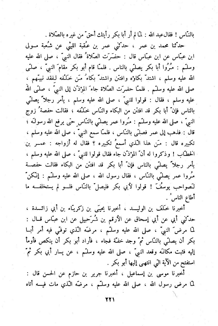 حَدَّثَنَا مُحَمَّدُ بْنُ عُمَرَ، حَدَّثَنِي عُمَرُ بْنُ عُقْبَةَ اللَّيْثِيُّ، عَنْ شُعْبَةَ مَوْلَى ابْنِ عَبَّاسٍ، عَنِ ابْنِ عَبَّاسٍ، قَالَ: حَضَرَتِ الصَّلَاةُ فَقَالَ النَّبِيُّ صلّى الله عليه وسلم: «§مُرُوا أَبَا بَكْرٍ يُصَلِّي بِالنَّاسِ» . فَلَمَّا قَامَ أَبُو بَكْرٍ مَقَامَ النَّبِيِّ صلّى الله عليه وسلم اشْتَدَّ بُكَاؤُهُ وَافْتُتِنَ، وَاشْتَدَّ بُكَاءُ مَنْ خَلْفَهُ لِفَقْدِ نَبِيِّهِمْ صلّى الله عليه وسلم، فَلَمَّا حَضَرَتِ الصَّلَاةُ جَاءَ الْمُؤَذِّنُ إِلَى النَّبِيِّ صلّى الله عليه وسلم، فَقَالَ: قُولُوا لِلنَّبِيِّ صلّى الله عليه وسلم يَأْمُرُ رَجُلًا يُصَلِّي بِالنَّاسِ، فَإِنَّ أَبَا بَكْرٍ قَدِ افْتُتِنَ مِنَ الْبُكَاءِ وَالنَّاسِ خَلْفَهُ؛ فَقَالَتْ حَفْصَةُ زَوْجُ النَّبِيِّ صلّى الله عليه وسلم: مُرُوا عُمَرَ يُصَلِّي بِالنَّاسِ حَتَّى يَرْفَعَ اللَّهُ رَسُولَهُ؛ قَالَ: فَذَهَبَ إِلَى عُمَرَ فَصَلَّى بِالنَّاسِ، فَلَمَّا سَمِعَ النَّبِيُّ صلّى الله عليه وسلم تَكْبِيرَهُ قَالَ: " مَنْ هَذَا الَّذِي أَسْمَعُ تَكْبِيرَهُ؟ فَقَالَ لَهُ أَزْوَاجُهُ: عُمَرُ بْنُ الْخَطَّابِ، وَذَكَرُوا لَهُ أَنَّ الْمُؤَذِّنَ جَاءَ، فَقَالَ: قُولُوا لِلنَّبِيِّ صلّى الله عليه وسلم يَأْمُرُ رَجُلًا يُصَلِّي بِالنَّاسِ، فَإِنَّ أَبَا بَكْرٍ قَدِ افْتُتِنَ مِنَ الْبُكَاءِ فَقَالَتْ حَفْصَةُ: مُرُوا عُمَرَ يُصَلِّي بِالنَّاسِ، فَقَالَ رَسُولُ اللَّهِ صلّى الله عليه وسلم: «إِنَّكُنَّ لَصَوَاحِبُ يُوسُفَ، قُولُوا لِأَبِي بَكْرٍ فَلْيُصَلِّ بِالنَّاسِ» ، فَلَوْ لَمْ يَسْتَخْلِفْهُ مَا أَطَاعَ النَّاسُ "