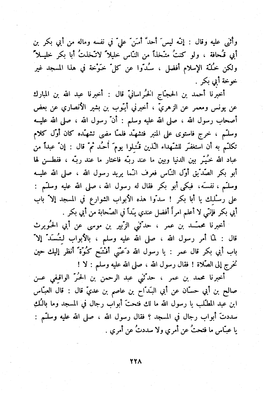 أَخْبَرَنَا أَحْمَدُ بْنُ الْحَجَّاجِ الْخُرَاسَانِيُّ، قَالَ: أَخْبَرَنَا عَبْدُ اللَّهِ بْنُ الْمُبَارَكِ، عَنْ يُونُسَ، وَمَعْمَرٌ، عَنِ الزُّهْرِيِّ، أَخْبَرَنِي أَيُّوبُ بْنُ بَشِيرٍ الْأَنْصَارِيُّ، عَنْ بَعْضِ أَصْحَابِ رَسُولِ اللَّهِ صلّى الله عليه وسلم: " أَنَّ رَسُولَ اللَّهِ صلّى الله عليه وسلم خَرَجَ فَاسْتَوَى عَلَى الْمِنْبَرِ فَتَشَهَّدَ، فَلَمَّا مَضَى تَشَهُّدُهُ كَانَ أَوَّلَ كَلَامٍ تَكَلَّمَ بِهِ أَنِ اسْتَغْفَرَ لِلشُّهَدَاءِ الَّذِينَ قُتِلُوا يَوْمَ أُحُدٍ، ثُمَّ قَالَ: «§إِنَّ عَبْدًا مِنْ عَبَّادِ اللَّهِ خُيِّرَ بَيْنَ الدُّنْيَا وَبَيْنَ مَا عِنْدَ رَبِّهِ فَاخْتَارَ مَا عِنْدَ رَبِّهِ» ، فَفَطِنَ لَهَا أَبُو بَكْرٍ الصِّدِّيقُ أَوَّلَ النَّاسِ، فَعَرَفَ أَنَّمَا يُرِيدُ رَسُولُ اللَّهِ صلّى الله عليه وسلم نَفْسَهُ، فَبَكَى أَبُو بَكْرٍ، فَقَالَ لَهُ رَسُولُ اللَّهِ صلّى الله عليه وسلم: «عَلَى رِسْلِكَ يَا أَبَا بَكْرٍ، سُدُّوا هَذِهِ الْأَبْوَابَ الشَّوَارِعَ فِي الْمَسْجِدِ إِلَّا بَابَ أَبِي بَكْرٍ، فَإِنِّي لَا أَعْلَمُ امْرَأً أَفْضَلَ عِنْدِي يَدًا فِي الصَّحَابَةِ مِنْ أَبِي بَكْرٍ»