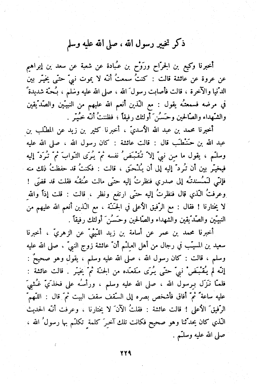 أَخْبَرَنَا وَكِيعُ بْنُ الْجَرَّاحِ، وَرَوْحُ بْنُ عُبَادَةَ، عَنْ شُعْبَةَ، عَنْ سَعْدِ بْنِ إِبْرَاهِيمَ، عَنْ عُرْوَةَ، عَنْ عَائِشَةَ، قَالَتْ: " كُنْتُ سَمِعْتُ أَنَّهُ، §لَا يَمُوتُ نَبِيٌّ حَتَّى يُخَيَّرَ بَيْنَ الدُّنْيَا وَالْآخِرَةِ، قَالَتْ: فَأَصَابَتْ رَسُولَ اللَّهِ صلّى الله عليه وسلم بُحَّةٌ شَدِيدَةٌ فِي مَرَضِهِ فَسَمِعْتُهُ يَقُولُ: « {مَعَ الَّذِينَ أَنْعَمَ اللَّهُ عَلَيْهِمْ مِنَ النَّبِيِّينَ وَالصِّدِّيقِينَ وَالشُّهَدَاءِ وَالصَّالِحِينَ وَحَسُنَ أُولَئِكَ رَفِيقًا» } [النساء: 69] ، فَظَنَنْتُ أَنَّهُ خُيِّرَ