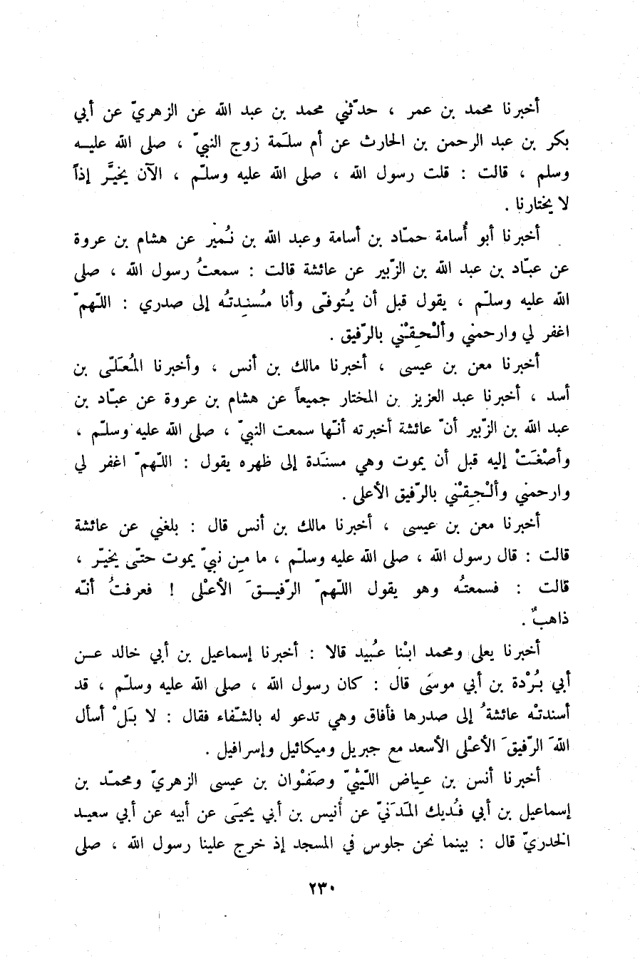 أَخْبَرَنَا مَعْنُ بْنُ عِيسَى، أَخْبَرَنَا مَالِكُ بْنُ أَنَسٍ، وَأَخْبَرَنَا الْمُعَلَّى بْنُ أَسَدٍ، أَخْبَرَنَا عَبْدُ الْعَزِيزِ بْنُ الْمُخْتَارِ، جَمِيعًا عَنْ هِشَامِ بْنِ عُرْوَةَ، عَنْ عَبَّادِ بْنِ عَبْدِ اللَّهِ بْنِ الزُّبَيْرِ، أَنَّ عَائِشَةَ، أَخْبَرَتْهُ أَنَّهَا سَمِعَتِ النَّبِيَّ صلّى الله عليه وسلم وَأَصْغَتْ إِلَيْهِ قَبْلَ أَنْ يَمُوتَ وَهِيَ مُسْنَدَةٌ إِلَى ظَهْرِهِ، يَقُولُ: «§اللَّهُمَّ اغْفِرْ لِي، وَارْحَمْنِي، وَأَلْحِقْنِي بِالرَّفِيقِ الْأَعْلَى»