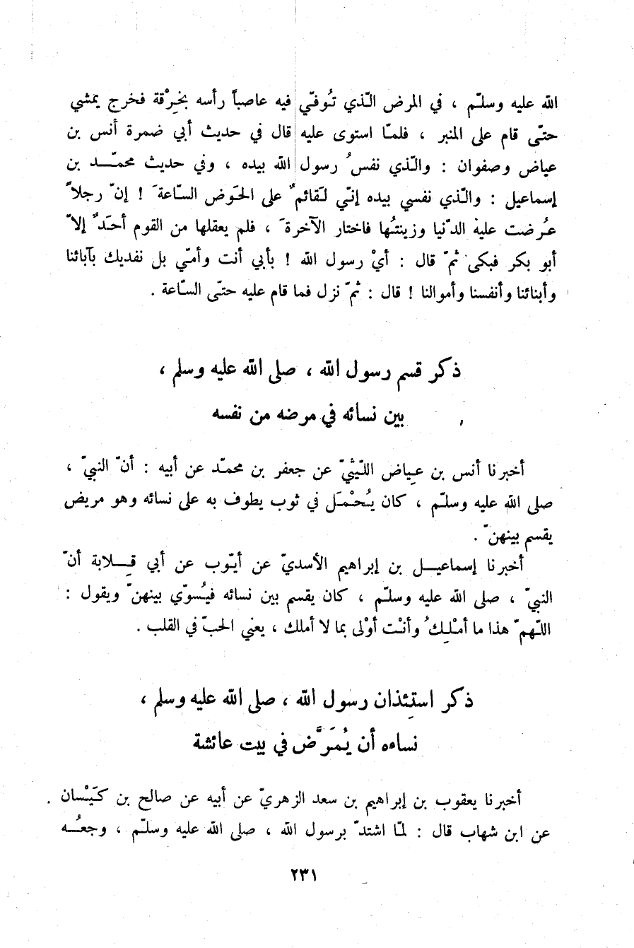 أَخْبَرَنَا أَنَسُ بْنُ عِيَاضٍ اللَّيْثِيُّ، عَنْ جَعْفَرِ بْنِ مُحَمَّدٍ، عَنْ أَبِيهِ: «أَنَّ النَّبِيَّ صلّى الله عليه وسلم §كَانَ يُحْمَلُ فِي ثَوْبٍ يُطَافُ بِهِ عَلَى نِسَائِهِ وَهُوَ مَرِيضٌ يَقْسِمُ بَيْنَهُنَّ»