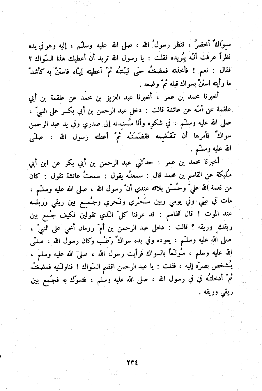 أَخْبَرَنَا مُحَمَّدُ بْنُ عُمَرَ، حَدَّثَنِي عَبْدُ الرَّحْمَنِ بْنُ أَبِي بَكْرٍ، عَنِ ابْنِ أَبِي مُلَيْكَةَ، عَنِ الْقَاسِمِ بْنِ مُحَمَّدٍ، قَالَ: سَمِعْتُهُ يَقُولُ: سَمِعْتُ عَائِشَةَ، تَقُولُ: " كَانَ مِنْ نِعْمَةِ اللَّهِ عَلَيَّ وَحُسْنِ بَلَائِهِ عِنْدِي أَنَّ رَسُولَ اللَّهِ صلّى الله عليه وسلم مَاتَ فِي بَيْتِي وَفِي يَوْمِي وَبَيْنَ سَحْرِي وَنَحْرِي وَجُمِعَ بَيْنَ رِيقِي وَرِيقِهِ عِنْدَ الْمَوْتِ، قَالَ الْقَاسِمُ: قَدْ عَرَفْنَا كُلَّ الَّذِي تَقُولِينَ فَكَيْفَ جُمِعَ بَيْنَ رِيقِكِ وَرِيقِهِ؟ قَالَتْ: دَخَلَ عَبْدُ الرَّحْمَنِ ابْنُ أُمِّ رُومَانَ أَخِي عَلَى النَّبِيِّ صلّى الله عليه وسلم يَعُودُهُ، وَفِي يَدِهِ سِوَاكٌ رَطْبٌ، وَكَانَ رَسُولُ اللَّهِ صلّى الله عليه وسلم مُولَعًا بِالسِّوَاكِ، فَرَأَيْتُ رَسُولَ اللَّهِ صلّى الله عليه وسلم يُشْخِصُ بَصَرَهُ إِلَيْهِ، فَقُلْتُ: يَا عَبْدَ الرَّحْمَنِ اقْضُمِ السِّوَاكِ فَنَاوَلَنِيهِ، §فَمَضَغْتُهُ ثُمَّ أَدْخَلْتُهُ فِي فِيِّ رَسُولِ اللَّهِ صلّى الله عليه وسلم، فَتَسَوَّكَ بِهِ، فَجُمِعَ بَيْنَ رِيقِي وَرِيقِهِ "