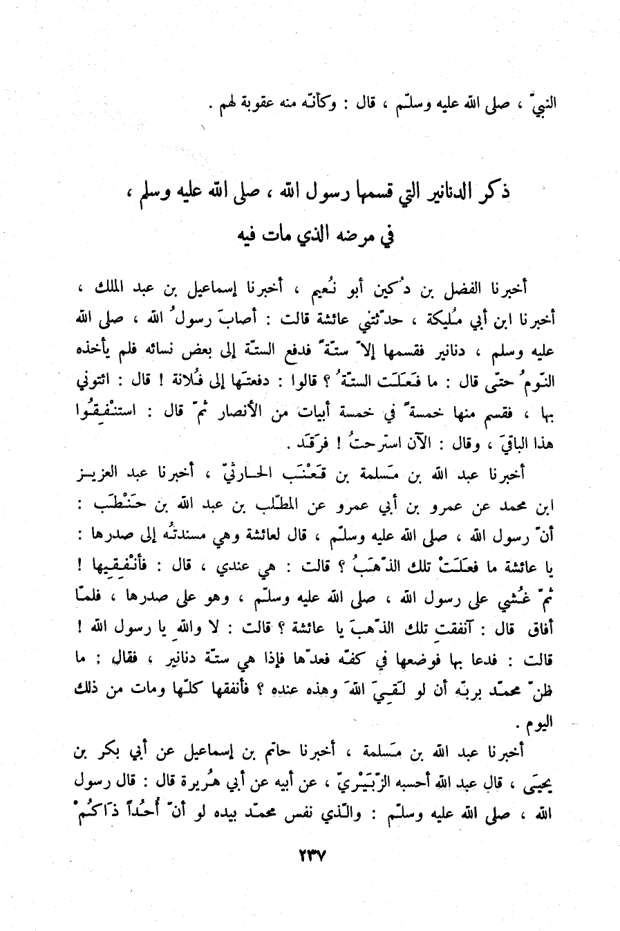 أَخْبَرَنَا الْفَضْلُ بْنُ دُكَيْنٍ أَبُو نُعَيْمٍ، أَخْبَرَنَا إِسْمَاعِيلُ بْنُ عَبْدِ الْمَلِكِ، أَخْبَرَنَا ابْنُ أَبِي مُلَيْكَةَ، حَدَّثَتْنِي عَائِشَةُ، قَالَتْ: " أَصَابَ رَسُولُ اللَّهِ صلّى الله عليه وسلم دَنَانِيرَ فَقَسَمَهَا إِلَّا سِتَّةً فَدَفَعَ السِّتَّةَ إِلَى بَعْضِ نِسَائِهِ، فَلَمْ يَأْخُذْهُ النَّوْمُ حَتَّى قَالَ: «مَا فَعَلَتِ السِّتَّةُ؟» قَالُوا: دَفَعْتَهَا إِلَى فُلَانَةَ قَالَ: «ائْتُونِي بِهَا» ، فَقَسَمَ مِنْهَا خَمْسَةً فِي خَمْسَةِ أَبْيَاتٍ مِنَ الْأَنْصَارِ ثُمَّ قَالَ: «§اسْتَنْفِقُوا هَذَا الْبَاقِيَ» ، وَقَالَ: «الْآنَ اسْتَرَحْتُ» فَرْقَدَ "