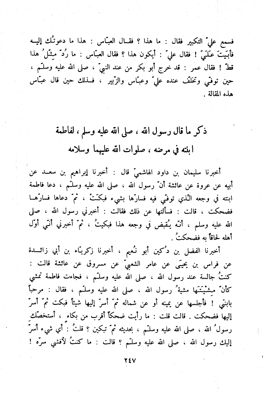 أَخْبَرَنَا سُلَيْمَانُ بْنُ دَاوُدَ الْهَاشِمِيُّ، قَالَ: أَخْبَرَنَا إِبْرَاهِيمُ بْنُ سَعْدٍ، عَنْ أَبِيهِ، عَنْ عُرْوَةَ، عَنْ عَائِشَةَ: " أَنَّ رَسُولَ اللَّهِ صلّى الله عليه وسلم دَعَا فَاطِمَةَ ابْنَتَهُ فِي وَجَعِهِ الَّذِي تُوُفِّيَ فِيهِ، فَسَارَّهَا بِشَيْءٍ فَبَكَتْ، ثُمَّ دَعَا فَسَارَّهَا فَضَحِكَتْ، قَالَتْ: فَسَأَلْتُهَا عَنْ ذَلِكَ فَقَالَتْ: «§أَخْبَرَنِي رَسُولُ اللَّهِ صلّى الله عليه وسلم أَنَّهُ يُقْبَضُ فِي وَجَعِهِ هَذَا، فَبَكَيْتُ، ثُمَّ أَخْبَرَنِي أَنِّي أَوَّلُ أَهْلِهِ لَحَاقًا بِهِ فَضَحِكْتُ»