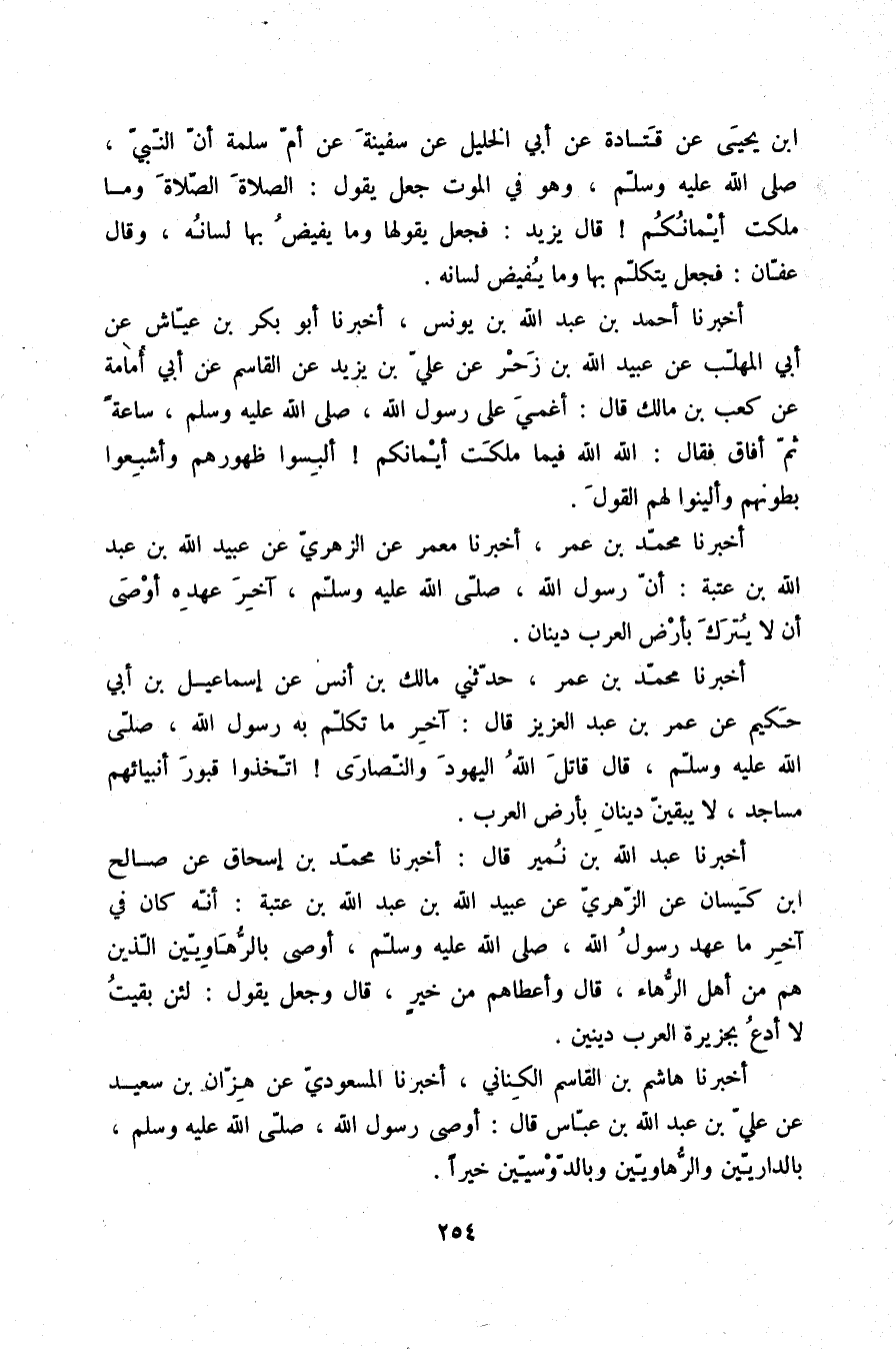 أَخْبَرَنَا عَبْدُ اللَّهِ بْنُ نُمَيْرٍ، قَالَ: أَخْبَرَنَا مُحَمَّدُ بْنُ إِسْحَاقَ، عَنْ صَالِحِ بْنِ كَيْسَانَ، عَنِ الزُّهْرِيِّ، عَنْ عُبَيْدِ اللَّهِ بْنِ عَبْدِ اللَّهِ بْنِ عُتْبَةَ: أَنَّهُ كَانَ فِي آخِرِ مَا عَهِدَ رَسُولُ اللَّهِ صلّى الله عليه وسلم أَوْصَى بِالرُّهَاوِيِّينَ الَّذِينَ هُمْ مِنْ أَهْلِ الرُّهَاءِ , قَالَ: وَأَعْطَاهُمْ مِنْ خَيْرٍ، قَالَ: وَجَعَلَ يَقُولُ: «لَئِنْ بَقِيتُ §لَا أَدَعُ بِجَزِيرَةِ الْعَرَبِ دِينَيْنِ»