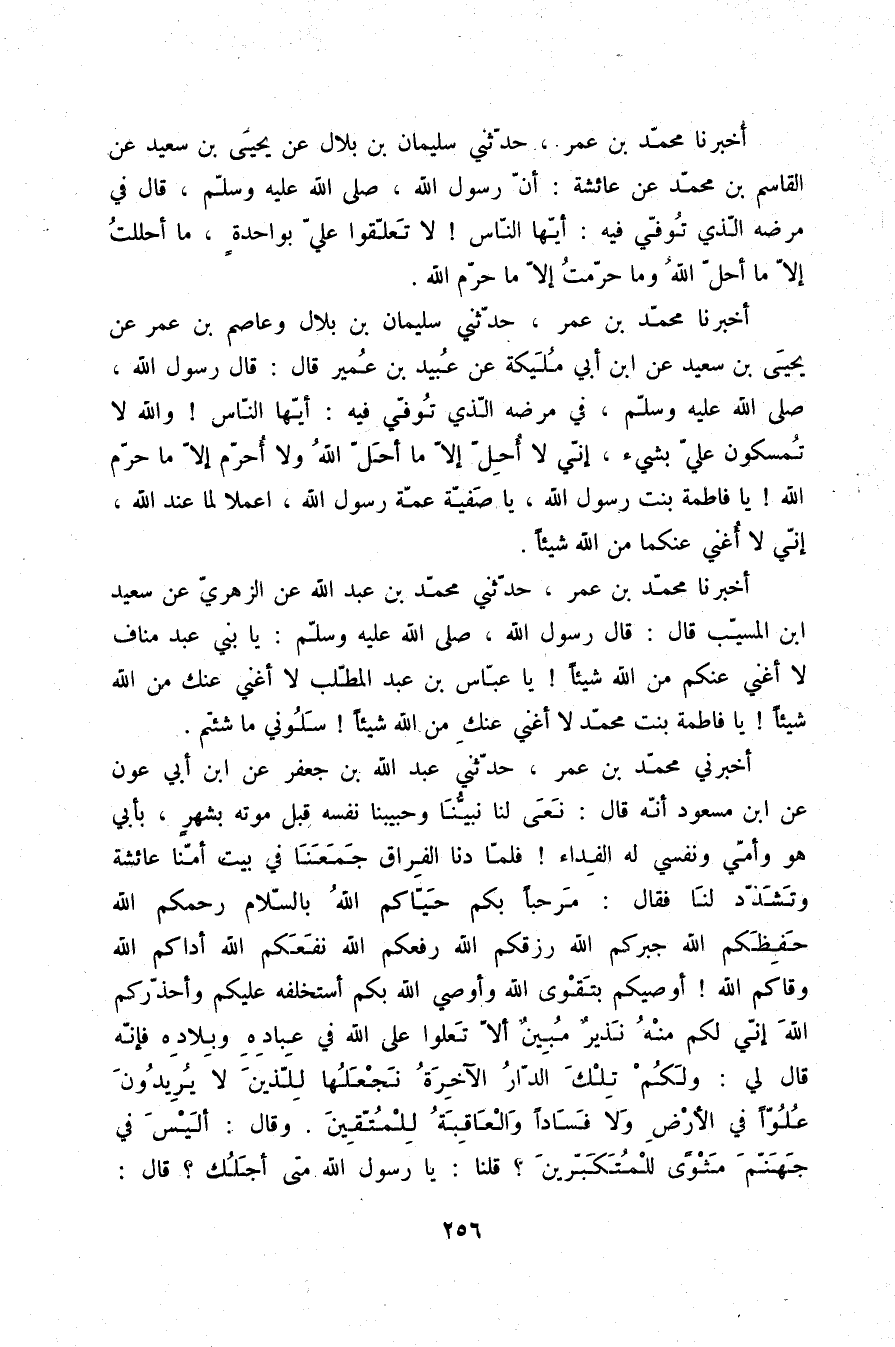 أَخْبَرَنَا مُحَمَّدُ بْنُ عُمَرَ، حَدَّثَنِي سُلَيْمَانُ بْنُ بِلَالٍ، وَعَاصِمُ بْنُ عُمَرَ، عَنْ يَحْيَى بْنِ سَعِيدٍ، عَنِ ابْنِ أَبِي مُلَيْكَةَ، عَنْ عُبَيْدِ بْنِ عُمَيْرٍ، قَالَ: قَالَ رَسُولُ اللَّهِ صلّى الله عليه وسلم فِي مَرَضِهِ الَّذِي تُوُفِّيَ فِيهِ: «أَيُّهَا النَّاسُ وَاللَّهِ لَا تُمْسِكُونَ عَلَيَّ بِشَيْءٍ , إِنِّي §لَا أُحِلُّ إِلَّا مَا أَحَلَّ اللَّهُ، وَلَا أُحَرِّمُ إِلَّا مَا حَرَّمَ اللَّهُ يَا فَاطِمَةَ بِنْتَ رَسُولِ اللَّهِ , يَا صَفِيَّةُ عَمَّةَ رَسُولِ اللَّهِ , اعْمَلَا لِمَا عِنْدَ اللَّهِ , إِنِّي لَا أُغْنِي عَنْكُمَا مِنَ اللَّهِ شَيْئًا»