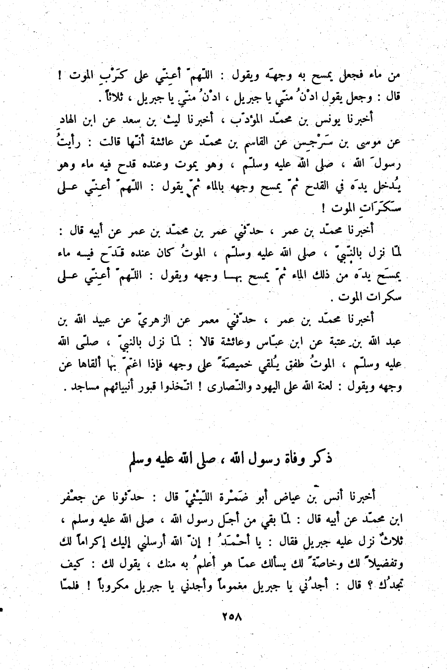 أَخْبَرَنَا أَنَسُ بْنُ عِيَاضٍ أَبُو ضَمْرَةَ اللَّيْثِيُّ، قَالَ: حَدَّثُونَا عَنْ جَعْفَرِ بْنِ مُحَمَّدٍ، عَنْ أَبِيهِ قَالَ: " لَمَّا بَقِيَ مِنْ أَجْلِ رَسُولِ اللَّهِ صلّى الله عليه وسلم ثَلَاثٌ نَزَلَ عَلَيْهِ جِبْرِيلُ، فَقَالَ: يَا أَحْمَدُ، إِنَّ اللَّهَ أَرْسَلَنِي إِلَيْكَ إِكْرَامًا لَكَ وَتَفْضِيلًا لَكَ وَخَاصَّةً لَكَ يَسْأَلُكَ عَمَّا هُوَ أَعْلَمُ بِهِ مِنْكَ , يَقُولُ لَكَ: كَيْفَ تَجِدُكَ؟، قَالَ: «§أَجِدُنِي يَا جِبْرِيلُ مَغْمُومًا، وَأَجِدُنِي يَا جِبْرِيلُ مَكْرُوبًا» فَلَمَّا -[259]- كَانَ الْيَوْمُ الثَّانِي هَبَطَ إِلَيْهِ جِبْرِيلُ فَقَالَ: يَا أَحْمَدُ إِنَّ اللَّهَ أَرْسَلَنِي إِلَيْكَ إِكْرَامًا لَكَ وَتَفْضِيلًا لَكَ وَخَاصَّةً لَكَ يَسْأَلُكَ عَمَّا هُوَ أَعْلَمُ بِهِ مِنْكَ , يَقُولُ لَكَ: كَيْفَ تَجِدُكَ؟ فَقَالَ: «أَجِدُنِي يَا جِبْرِيلُ مَغْمُومًا، وَأَجِدُنِي يَا جِبْرِيلُ مَكْرُوبًا» ، فَلَمَّا كَانَ الْيَوْمُ الثَّالِثُ نَزَلَ عَلَيْهِ جِبْرِيلُ وَهَبَطَ مَعَهُ مَلَكُ الْمَوْتِ وَنَزَلَ مَعَهُ مَلَكٌ يُقَالُ لَهُ: إِسْمَاعِيلُ يَسْكُنُ الْهَوَاءَ لَمْ يَصْعَدْ إِلَى السَّمَاءِ قَطُّ، وَلَمْ يَهْبِطِ إِلَى الْأَرْضِ مُنْذُ يَوْمَ كَانَتِ الْأَرْضُ، عَلَى سَبْعِينَ أَلْفِ مَلَكٍ لَيْسَ مِنْهُمْ مَلَكٌ إِلَّا عَلَى سَبْعِينَ أَلْفِ مَلَكٍ، فَسَبَقَهُمْ جِبْرِيلُ فَقَالَ: يَا أَحْمَدُ، إِنَّ اللَّهَ أَرْسَلَنِي إِلَيْكَ إِكْرَامًا لَكَ وَتَفْضِيلًا لَكَ وَخَاصَّةً لَكَ يَسْأَلُكَ عَمَّا هُوَ أَعْلَمُ بِهِ مِنْكَ , وَيَقُولُ لَكَ: كَيْفَ تَجِدُكَ؟ قَالَ: «أَجِدُنِي يَا جِبْرِيلُ مَغْمُومًا، وَأَجِدُنِي يَا جِبْرِيلُ مَكْرُوبًا» ، ثُمَّ اسْتَأْذَنَ مَلَكُ الْمَوْتِ فَقَالَ: جِبْرِيلُ: يَا أَحْمَدُ، هَذَا مَلَكُ الْمَوْتِ يَسْتَأْذِنُ عَلَيْكَ وَلَمْ يَسْتَأْذِنْ عَلَى آدَمَيٍّ كَانَ قَبْلَكَ وَلَا يَسْتَأْذِنُ عَلَى آدَمَيٍّ بَعْدَكَ قَالَ: «ائْذَنْ لَهُ» فَدَخَلَ مَلَكُ الْمَوْتِ فَوَقَفَ بَيْنَ يَدَيْ رَسُولِ اللَّهِ صلّى الله عليه وسلم فَقَالَ: يَا رَسُولَ اللَّهِ، يَا أَحْمَدُ إِنَّ اللَّهَ أَرْسَلَنِي إِلَيْكَ وَأَمَرَنِي أَنْ أُطِيعَكَ فِي كُلِّ مَا تَأْمُرُنِي , إِنْ أَمَرْتَنِي أَنْ أَقْبِضَ نَفْسَكَ قَبَضْتُهَا وَإِنْ أَمَرْتَنِي أَنْ أَتْرُكَهَا تَرَكْتُهَا قَالَ: «وَتَفْعَلُ يَا مَلَكَ الْمَوْتِ؟» ، قَالَ: بِذَلِكَ أُمِرْتُ أَنْ أُطِيعَكَ فِي كُلِّ مَا أَمَرْتَنِي فَقَالَ: جِبْرِيلُ: يَا أَحْمَدُ إِنَّ اللَّهَ قَدِ اشْتَاقَ إِلَيْكَ قَالَ: «فَامْضِ يَا مَلَكَ الْمَوْتِ لَمَا أُمِرْتَ بِهِ» قَالَ: جِبْرِيلُ: السَّلَامُ عَلَيْكَ يَا رَسُولَ اللَّهِ هَذَا آخِرُ مُوَاطَئِي الْأَرْضَ، إِنَّمَا كُنْتَ حَاجَتِي مِنَ الدُّنْيَا " فَتُوُفِّيَ رَسُولُ اللَّهِ صلّى الله عليه وسلم وَجَاءَتِ التَّعْزِيَةُ يَسْمَعُونَ الصَّوْتَ وَالْحِسَّ وَلَا يَرَوْنَ الشَّخْصَ: " السَّلَامُ عَلَيْكُمْ يَا أَهْلَ الْبَيْتِ وَرَحْمَةُ اللَّهِ وَبَرَكَاتُهُ {كُلُّ نَفْسٍ ذَائِقَةُ الْمَوْتِ وَإِنَّمَا تُوفُونَ أُجُورَكُمْ يَوْمَ الْقِيَامَةِ} [آل عمران: 185] إِنَّ فِي اللَّهِ عَزَاءً عَنْ كُلِّ مُصِيبَةٍ وَخَلَفًا مِنْ كُلِّ هَالِكٍ وَدَرَكًا مِنْ كُلِّ مَا فَاتَ , فَبِاللَّهِ فَثِقُوا، وَإِيَّاهُ فَارْجُوا، إِنَّمَا الْمُصَابُ مَنْ حُرِمَ الثَّوَابَ , وَالسَّلَامُ عَلَيْكُمْ وَرَحْمَةُ اللَّهِ وَبَرَكَاتُهُ " -[260]-. أَخْبَرَنَا مُحَمَّدُ بْنُ عُمَرَ، أَخْبَرَنَا رَجُلٌ، عَنْ جَعْفَرِ بْنِ مُحَمَّدٍ، عَنْ أَبِيهِ، عَنْ عَلِيٍّ: وَدَخَلَ عَلَيْهِ رَجُلَانِ مِنْ قُرَيْشٍ، فَقَالَ: " أَلَا أُخْبِرْكُمَا عَنْ رَسُولِ اللَّهِ صلّى الله عليه وسلم؟ قَالَا: بَلَى، ح