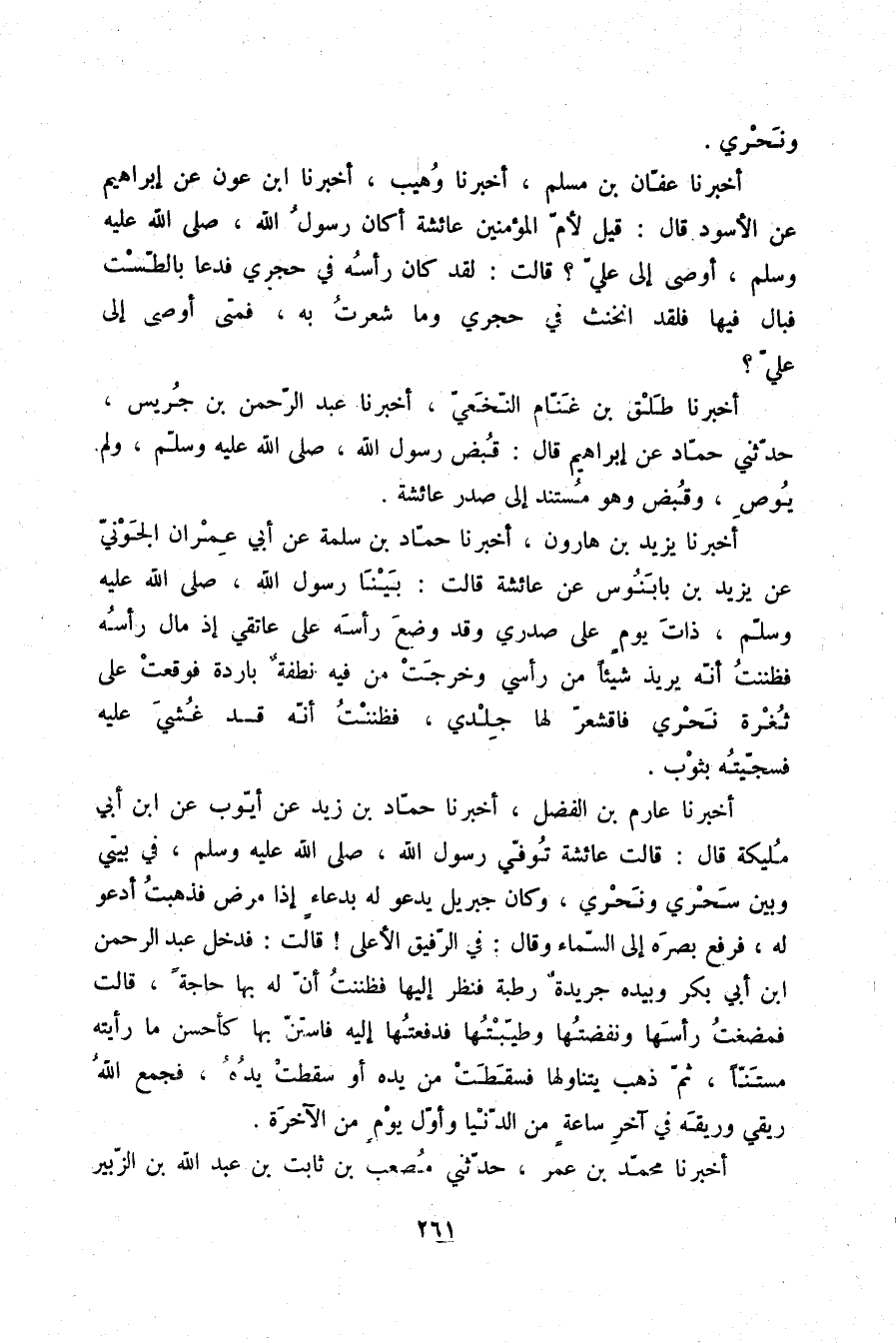 أَخْبَرَنَا طَلْقُ بْنُ غَنَّامٍ النَّخَعِيُّ، أَخْبَرَنَا عَبْدُ الرَّحْمَنِ بْنُ جُرَيْسٍ، حَدَّثَنِي حَمَّادٌ عَنْ إِبْرَاهِيمَ، قَالَ: «قُبِضَ رَسُولُ اللَّهِ صلّى الله عليه وسلم وَلَمْ يُوصِ، §وَقُبِضَ وَهُوَ مُسْتَنِدٌ إِلَى صَدْرِ عَائِشَةَ»