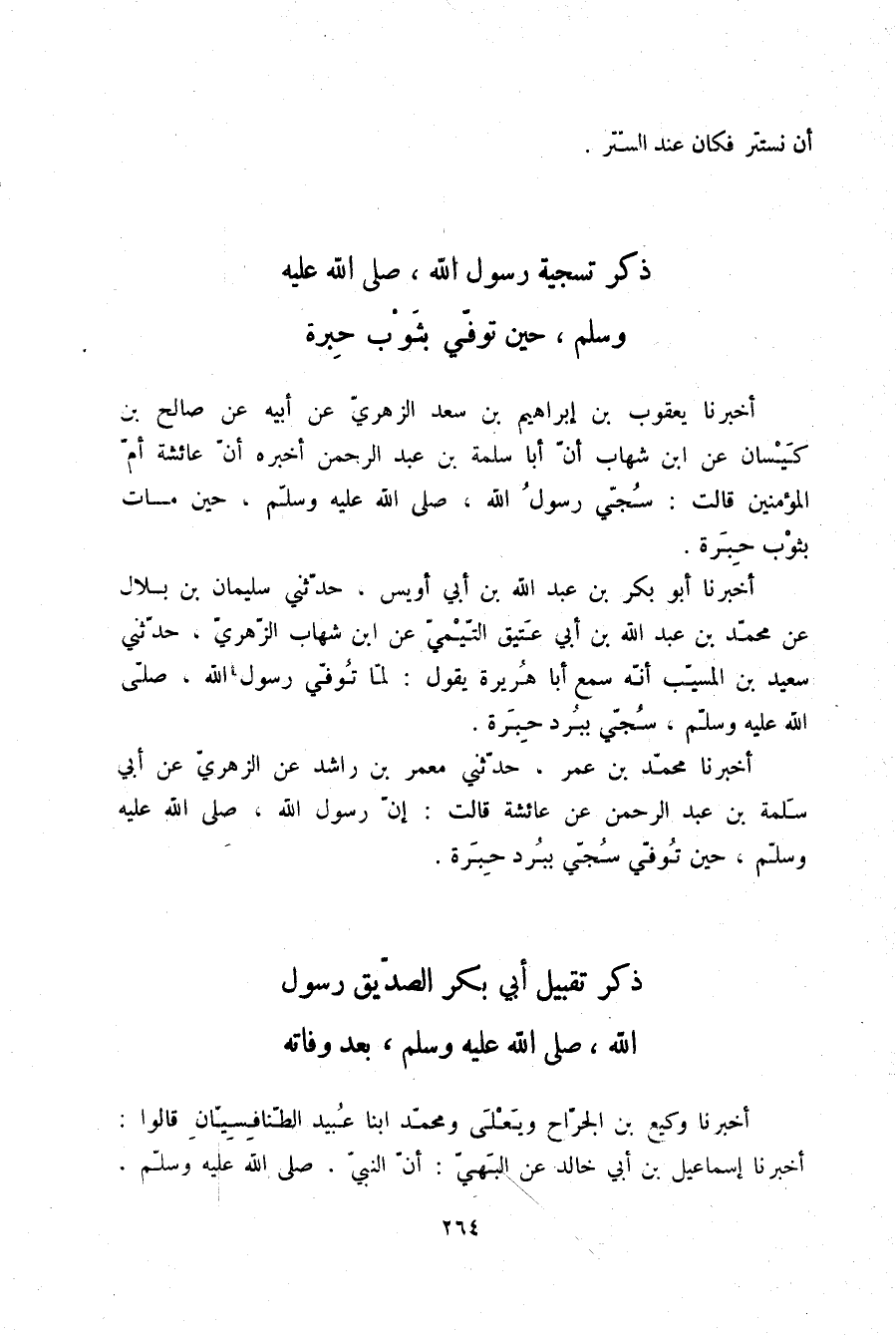 أَخْبَرَنَا يَعْقُوبُ بْنُ إِبْرَاهِيمَ بْنِ سَعْدٍ الزُّهْرِيُّ، عَنْ أَبِيهِ، عَنْ صَالِحِ بْنِ كَيْسَانَ، عَنِ ابْنِ شِهَابٍ، أَنَّ أَبَا سَلَمَةَ بْنَ عَبْدِ الرَّحْمَنِ، أَخْبَرَهُ أَنَّ عَائِشَةَ أُمَّ الْمُؤْمِنِينَ قَالَتْ: «§سُجِّيَ رَسُولُ اللَّهِ صلّى الله عليه وسلم حِينَ مَاتَ بِثَوْبٍ حِبَرَةٍ»