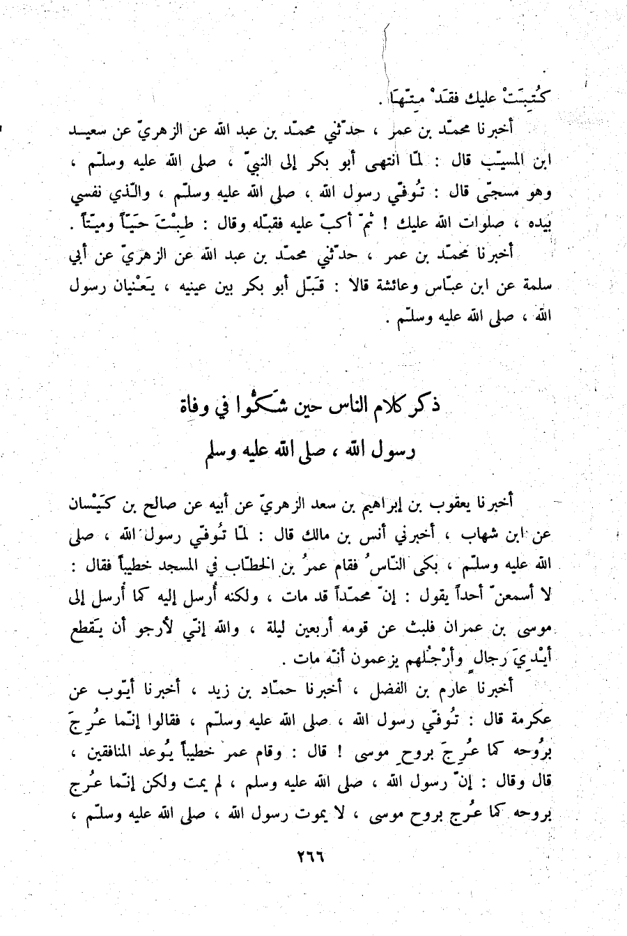 أَخْبَرَنَا يَعْقُوبُ بْنُ إِبْرَاهِيمَ بْنِ سَعْدٍ الزُّهْرِيُّ، عَنْ أَبِيهِ، عَنْ صَالِحِ بْنِ كَيْسَانَ، عَنِ ابْنِ شِهَابٍ، أَخْبَرَنِي أَنَسُ بْنُ مَالِكٍ، قَالَ: " لَمَّا تُوُفِّيَ رَسُولُ اللَّهِ صلّى الله عليه وسلم بَكَى النَّاسُ فَقَامَ عُمَرُ بْنُ الْخَطَّابِ فِي الْمَسْجِدِ خَطِيبًا فَقَالَ: «§لَا أَسْمَعَنَّ أَحَدًا يَقُولُ إِنَّ مُحَمَّدًا قَدْ مَاتَ , وَلَكِنَّهُ أُرْسِلَ إِلَيْهِ كَمَا أُرْسِلَ إِلَى مُوسَى بْنِ عِمْرَانَ فَلَبِثَ عَنْ قَوْمِهِ أَرْبَعِينَ لَيْلَةً , وَاللَّهِ إِنِّي لَأَرْجُو أَنْ يَقْطَعَ أَيْدِي رِجَالٍ وَأَرْجُلُهُمْ يَزْعُمُونَ أَنَّهُ مَاتَ»