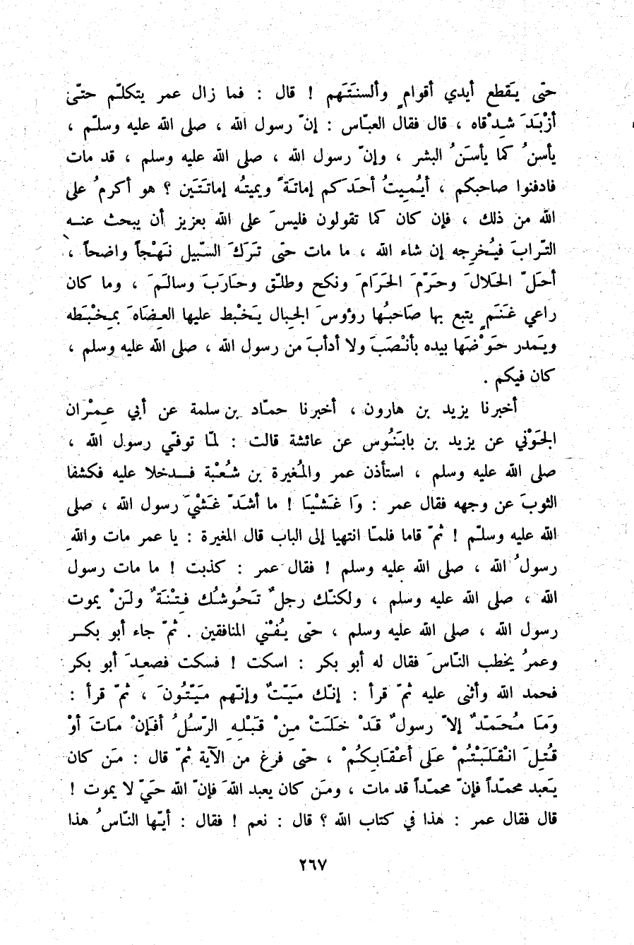 حَتَّى يَقْطَعَ أَيْدِي أَقْوَامٍ وَأَلْسِنَتَهُمْ قَالَ: فَمَا زَالَ عُمَرُ يَتَكَلَّمُ حَتَّى أَزْبَدَ شِدْقَاهُ , قَالَ: فَقَالَ الْعَبَّاسُ: «إِنَّ رَسُولَ اللَّهِ صلّى الله عليه وسلم يَأْسَنُ كَمَا يَأْسَنُ الْبَشَرُ , وَإِنَّ رَسُولَ اللَّهِ صلّى الله عليه وسلم قَدْ مَاتَ فَادْفِنُوا صَاحِبَكُمْ , §أَيُمِيتُ أَحَدَكُمْ إِمَاتَةً وَيُمِيتُهُ إِمَاتَتَيْنِ؟ هُوَ أَكْرَمُ عَلَى اللَّهِ مِنْ ذَلِكَ , فَإِنْ كَانَ كَمَا تَقُولُونَ فَلَيْسَ عَلَى اللَّهِ بِعَزِيزٍ أَنْ يَبْحَثَ عَنْهُ التُّرَابَ فَيُخْرِجَهُ إِنْ شَاءَ اللَّهُ , مَا مَاتَ حَتَّى تَرَكَ السَّبِيلَ نَهْجًا وَاضِحًا , أَحَلَّ الْحَلَالَ، وَحَرَّمَ الْحَرَامَ، وَنَكَحَ وَطَلَّقَ، وَحَارَبَ وَسَالَمَ , وَمَا كَانَ رَاعِيَ غَنَمٍ يَتَّبِعُ بِهَا صَاحِبُهَا رُءُوسَ الْجِبَالِ يَخْبِطُ عَلَيْهَا الْعِضَاةَ بِمِخْبَطِهِ وَيَمْدُرُ حَوْضَهَا بِيَدِهِ بِأَنْصَبَ وَلَا أَدْأَبَ مِنْ رَسُولِ اللَّهِ صلّى الله عليه وسلم كَانَ فِيكُمْ»