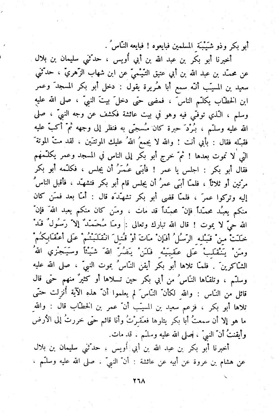 أَخْبَرَنَا أَبُو بَكْرِ بْنُ عَبْدِ اللَّهِ بْنِ أَبِي أُوَيْسٍ، حَدَّثَنِي سُلَيْمَانُ بْنُ بِلَالٍ، عَنْ هِشَامِ بْنِ عُرْوَةَ، عَنْ أَبِيهِ، عَنْ عَائِشَةَ: " أَنَّ النَّبِيَّ صلّى الله عليه وسلم -[269]- مَاتَ وَأَبُو بَكْرٍ بِالسُّنْحِ، فَقَامَ عُمَرُ فَجَعَلَ يَقُولُ: وَاللَّهِ §مَا مَاتَ رَسُولُ اللَّهِ صلّى الله عليه وسلم قَالَتْ: قَالَ عُمَرُ " وَاللَّهِ مَا كَانَ يَقَعُ فِي نَفْسِي إِلَّا ذَاكَ، وَلَيَبْعَثَنَّهُ اللَّهُ فَلَيَقْطَعَنَّ أَيْدِي رِجَالٍ وَأَرْجُلَهُمْ , فَجَاءَ أَبُو بَكْرٍ فَكَشَفَ عَنْ وَجْهِ النَّبِيِّ صلّى الله عليه وسلم فَقَبَّلَهُ وَقَالَ: " بِأَبِي أَنْتَ وَأُمِّي طِبْتَ حَيًّا وَمَيِّتًا، وَالَّذِي نَفْسِي بِيَدِهِ، لَا يُذِيقُكَ اللَّهُ الْمَوْتَتَيْنِ أَبَدًا ثُمَّ خَرَجَ فَقَالَ: أَيُّهَا الْحَالِفُ عَلَى رِسْلِكَ فَلَمْ يُكَلِّمْ أَبَا بَكْرٍ وَجَلَسَ عُمَرُ، فَحَمِدَ اللَّهَ أَبُو بَكْرٍ وَأَثْنَى عَلَيْهِ ثُمَّ قَالَ: أَلَا مَنْ كَانَ يَعْبُدُ مُحَمَّدًا فَإِنَّ مُحَمَّدًا قَدْ مَاتَ , وَمَنْ كَانَ يَعْبُدُ اللَّهَ فَإِنَّ اللَّهَ حَيُّ لَا يَمُوتُ. وَقَالَ: {إِنَّكَ مَيِّتٌ وَإِنَّهُمْ مَيِّتُونَ} [الزمر: 30] وَقَالَ: {وَمَا مُحَمَّدٌ إِلَّا رَسُولٌ قَدْ خَلَتْ مِنْ قَبْلِهِ الرُّسُلُ، أَفَإِنْ مَاتَ أَوْ قُتِلَ انْقَلَبْتُمْ عَلَى أَعْقَابِكُمْ وَمَنْ يَنْقَلِبْ عَلَى عَقِبَيْهِ فَلَنْ يَضُرَّ اللَّهَ شَيْئًا، وَسَيَجْزِي اللَّهُ الشَّاكِرِينَ} [آل عمران: 144] . فَنَشَجَ النَّاسُ يَبْكُونَ، وَاجْتَمَعَتِ الْأَنْصَارُ إِلَى سَعْدِ بْنِ عُبَادَةَ فِي سَقِيفَةِ بَنِي سَاعِدَةَ فَقَالُوا: مِنَّا أَمِيرٌ وَمِنْكُمْ أَمِيرٌ فَذَهَبَ إِلَيْهِمْ أَبُو بَكْرٍ وَعُمَرُ وَأَبُو عُبَيْدَةَ بْنُ الْجَرَّاحِ , فَذَهَبَ عُمَرُ يَتَكَلَّمُ فَأَسْكَتَهُ أَبُو بَكْرٍ فَكَانَ عُمَرُ يَقُولُ: وَاللَّهِ مَا أَرَدْتُ بِذَلِكَ إِلَّا أَنِّي قَدْ هَيَّأْتُ كَلَامًا قَدْ أَعْجَبَنِي خَشِيتُ أَنْ لَا يُبْلِغَهُ أَبُو بَكْرٍ , ثُمَّ تَكَلَّمَ أَبُو بَكْرٍ فَتَكَلَّمَ أَبْلَغُ النَّاسِ فَقَالَ فِي كَلَامِهِ: نَحْنُ الْأُمَرَاءُ وَأَنْتُمُ الْوُزَرَاءُ، فَقَالَ الْحُبَابُ بْنُ الْمُنْذِرِ السُّلَمِيُّ: لَا وَاللَّهِ لَا نَفْعَلُ أَبَدًا , مِنَّا أَمِيرٌ وَمِنْكُمْ أَمِيرٌ قَالَ: فَقَالَ أَبُو بَكْرٍ: لَا، وَلَكِنَّا الْأُمَرَاءُ وَأَنْتُمُ الْوُزَرَاءُ، هُمْ أَوْسَطُ الْعَرَبِ دَارًا، وَأَكْرَمُهُمْ أَحْسَابًا , يَعْنِي قُرَيْشًا , فَبَايِعُوا عُمَرَ وَأَبَا عُبَيْدَةَ , فَقَالَ عُمَرُ: بَلْ نُبَايِعُكَ أَنْتَ , فَأَنْتَ سَيِّدُنَا، وَأَنْتَ خَيْرُنَا، وَأَحَبُّنَا إِلَى نَبِيِّنَا صلّى الله عليه وسلم، فَأَخَذَ عُمَرُ بِيَدِهِ فَبَايَعَهُ , فَبَايَعَهُ النَّاسُ , فَقَالَ قَائِلٌ: قَتَلْتُمْ سَعْدَ بْنَ عُبَادَةَ فَقَالَ عُمَرُ: قَتَلَهُ اللَّهُ "