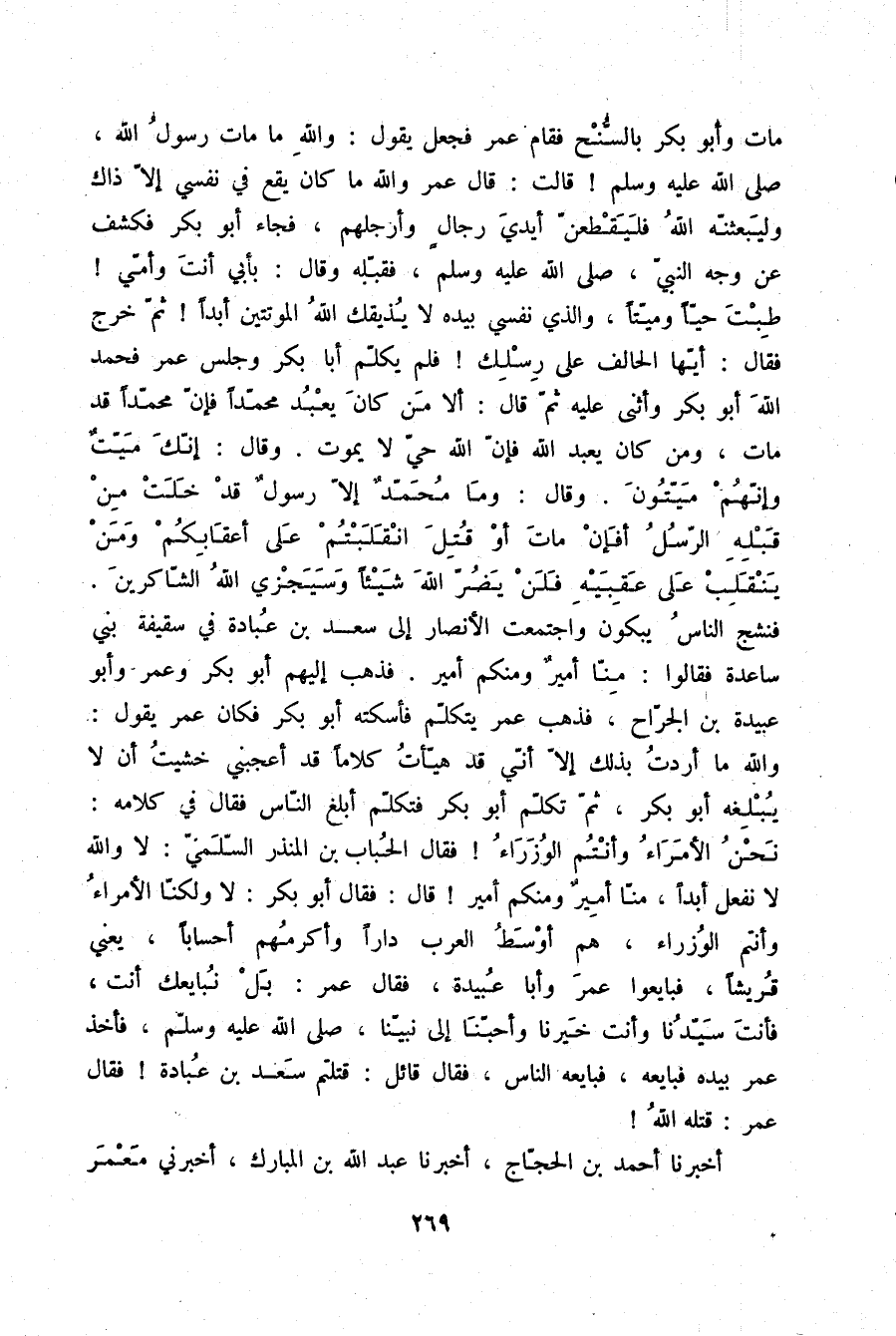 أَخْبَرَنَا أَحْمَدُ بْنُ الْحَجَّاجِ، أَخْبَرَنَا عَبْدُ اللَّهِ بْنُ الْمُبَارَكِ، أَخْبَرَنِي مَعْمَرٌ -[270]-، وَيُونُسُ، عَنِ الزُّهْرِيِّ، أَخْبَرَنِي أَنَسُ بْنُ مَالِكٍ: " أَنَّهُ لَمَّا تُوُفِّيَ رَسُولُ اللَّهِ صلّى الله عليه وسلم قَامَ عُمَرُ فِي النَّاسِ خَطِيبًا فَقَالَ: أَلَا §لَا أَسْمَعَنَّ أَحَدًا يَقُولُ إِنَّ مُحَمَّدًا مَاتَ، فَإِنَّ مُحَمَّدًا لَمْ يَمُتْ، وَلَكِنَّهُ أَرْسَلَ إِلَيْهِ رَبُّهُ كَمَا أَرْسَلَ إِلَى مُوسَى فَلَبِثَ عَنْ قَوْمِهِ أَرْبَعِينَ لَيْلَةً "