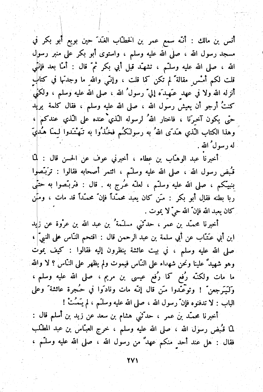 أَخْبَرَنَا مُحَمَّدُ بْنُ عُمَرَ، حَدَّثَنِي هِشَامُ بْنُ سَعْدٍ، عَنْ زَيْدِ بْنِ أَسْلَمَ، قَالَ: لَمَّا قُبِضَ رَسُولُ اللَّهِ صلّى الله عليه وسلم خَرَجَ الْعَبَّاسُ بْنُ عَبْدِ الْمُطَّلِبِ، فَقَالَ: «§هَلْ عِنْدَ أَحَدٍ مِنْكُمْ عَهْدٌ مِنْ رَسُولِ اللَّهِ صلّى الله عليه وسلم -[272]- فِي وَفَاتِهِ فَيُحَدِثْنَاهُ؟» ، فَقَالُوا: لَا قَالَ: هَلْ عِنْدَكَ يَا عُمَرُ مِنْ ذَلِكَ؟، قَالَ: لَا قَالَ الْعَبَّاسُ: «اشْهَدُوا أَنَّ أَحَدًا لَا يَشْهَدُ عَلَى نَبِيِّ اللَّهِ صلّى الله عليه وسلم بِعَهْدٍ عَهِدَهُ إِلَيْهِ بَعْدَ وَفَاتِهِ إِلَّا كَذَّابٌ، وَاللَّهِ الَّذِي لَا إِلَهَ إِلَّا هُوَ، لَقَدْ ذَاقَ رَسُولُ اللَّهِ صلّى الله عليه وسلم الْمَوْتَ»