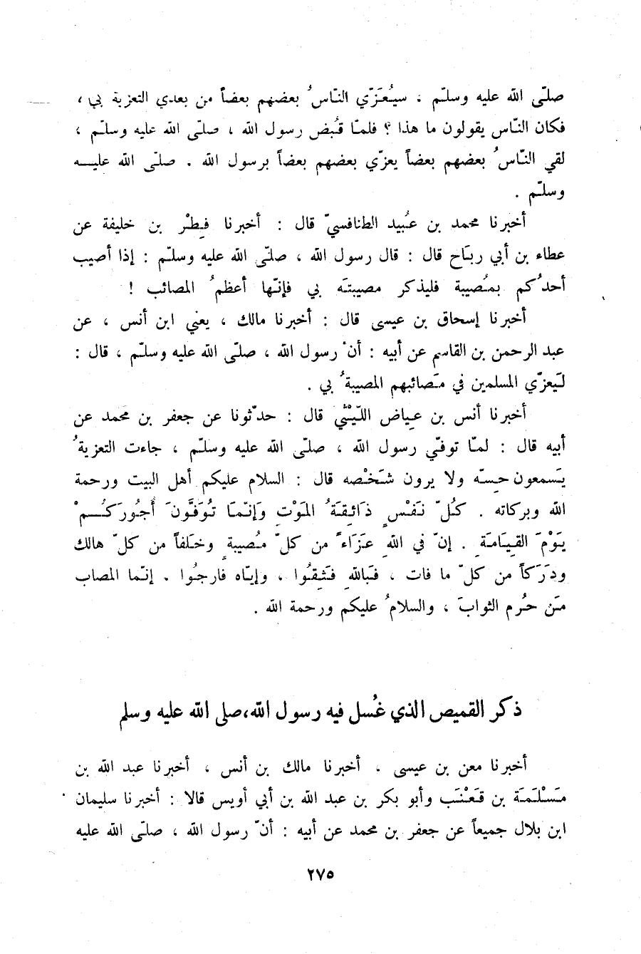 أَخْبَرَنَا أَنَسُ بْنُ عِيَاضٍ اللَّيْثِيُّ، قَالَ: حَدَّثُونَا عَنْ جَعْفَرِ بْنِ مُحَمَّدٍ، عَنْ أَبِيهِ قَالَ: " لَمَّا تُوُفِّيَ رَسُولُ اللَّهِ صلّى الله عليه وسلم جَاءَتِ التَّعْزِيَةُ يَسْمَعُونَ حِسَّهُ وَلَا يَرَوْنَ شَخْصَهُ، قَالَ: السَّلَامُ عَلَيْكُمْ أَهْلَ الْبَيْتِ وَرَحْمَةُ اللَّهِ وَبَرَكَاتُهُ. {كُلُّ نَفْسٍ ذَائِقَةُ الْمَوْتِ وَإِنَّمَا تُوَفَّوْنَ أُجُورَكُمْ يَوْمَ الْقِيَامَةِ} [آل عمران: 185] ، إِنَّ §فِي اللَّهِ عَزَاءً مِنْ كُلِّ مُصِيبَةٍ، وَخَلَفًا مِنْ كُلِّ هَالِكٍ، وَدَرَكًا مِنْ كُلِّ مَا فَاتَ , فَبِاللَّهِ فَثِقُوا , وَإِيَّاهُ فَارْجُوا , إِنَّمَا الْمُصَابُ مَنْ حُرِمَ الثَّوَابُ , وَالسَّلَامُ عَلَيْكُمْ وَرَحْمَةُ اللَّهِ "