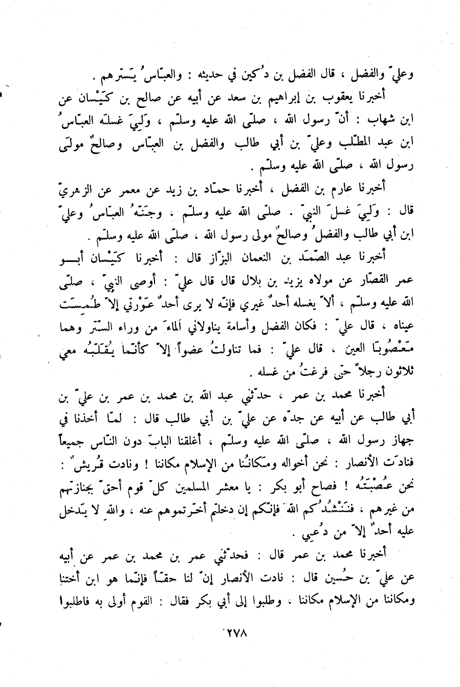 أَخْبَرَنَا عَارِمُ بْنُ الْفَضْلِ، أَخْبَرَنَا حَمَّادُ بْنُ زَيْدٍ، عَنْ مَعْمَرٍ، عَنِ الزُّهْرِيِّ، قَالَ: «§وَلِيَ غُسْلَ النَّبِيِّ صلّى الله عليه وسلم وَجَنَّهُ الْعَبَّاسُ، وَعَلِيُّ بْنُ أَبِي طَالِبٍ، وَالْفَضْلُ، وَصَالِحٌ مَوْلَى رَسُولِ اللَّهِ صلّى الله عليه وسلم»