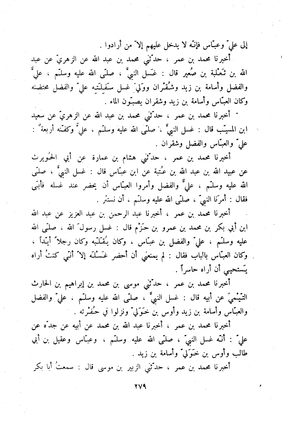 أَخْبَرَنَا مُحَمَّدُ بْنُ عُمَرَ، أَخْبَرَنَا عَبْدُ اللَّهِ بْنُ مُحَمَّدٍ، عَنْ أَبِيهِ، عَنْ جَدِّهِ، عَنْ عَلِيٍّ: «§أَنَّهُ غَسَلَ النَّبِيَّ صلّى الله عليه وسلم وَعَبَّاسٌ وَعُقَيْلُ بْنُ أَبِي طَالِبٍ وَأَوْسُ بْنُ خَوَلِيٍّ وَأُسَامَةُ بْنُ زَيْدٍ»