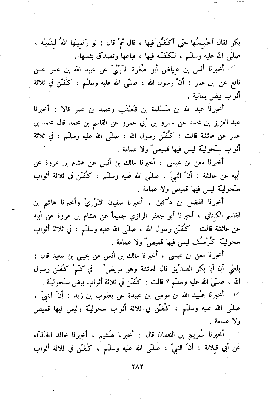 أَخْبَرَنَا أَنَسُ بْنُ عِيَاضٍ أَبُو صُفْرَةَ اللَّيْثِيُّ، عَنْ عُبَيْدِ اللَّهِ بْنِ عُمَرَ، عَنْ نَافِعٍ، عَنِ ابْنِ عُمَرَ: «أَنَّ رَسُولَ اللَّهِ صلّى الله عليه وسلم §كُفِّنَ فِي ثَلَاثَةِ أَثْوَابٍ بِيضٍ يَمَانِيَّةٍ»