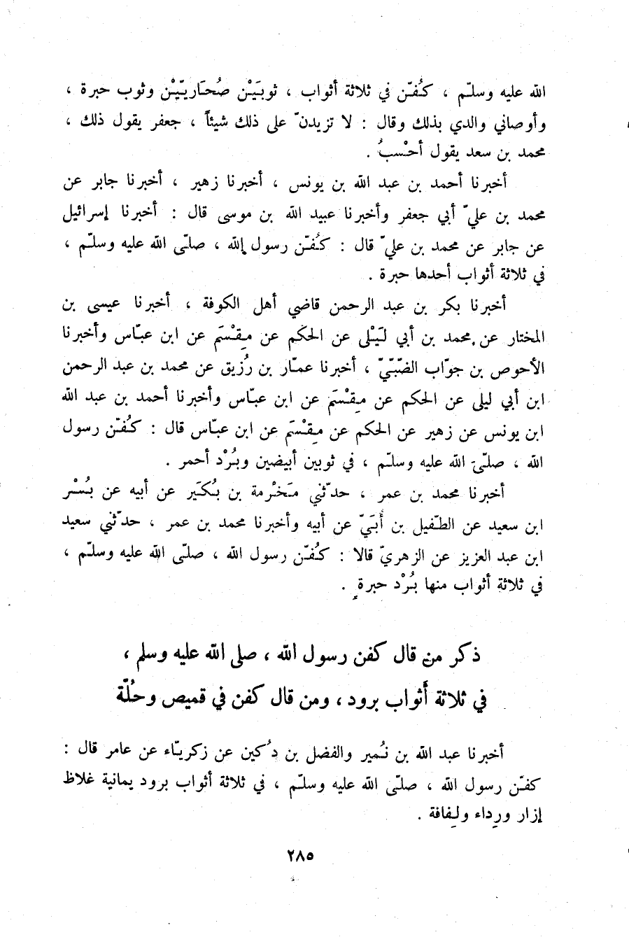 أَخْبَرَنَا أَحْمَدُ بْنُ عَبْدِ اللَّهِ بْنِ يُونُسَ، أَخْبَرَنَا زُهَيْرٌ، أَخْبَرَنَا جَابِرٌ، عَنْ مُحَمَّدِ بْنِ عَلِيٍّ أَبِي جَعْفَرٍ، وَأَخْبَرَنَا عُبَيْدُ اللَّهِ بْنُ مُوسَى، قَالَ: أَخْبَرَنَا إِسْرَائِيلُ، عَنْ جَابِرٍ، عَنْ مُحَمَّدِ بْنِ عَلِيٍّ، قَالَ: «§كُفِّنَ رَسُولُ اللَّهِ صلّى الله عليه وسلم فِي ثَلَاثَةِ أَثْوَابٍ، أَحَدُهَا حِبَرَةٌ»