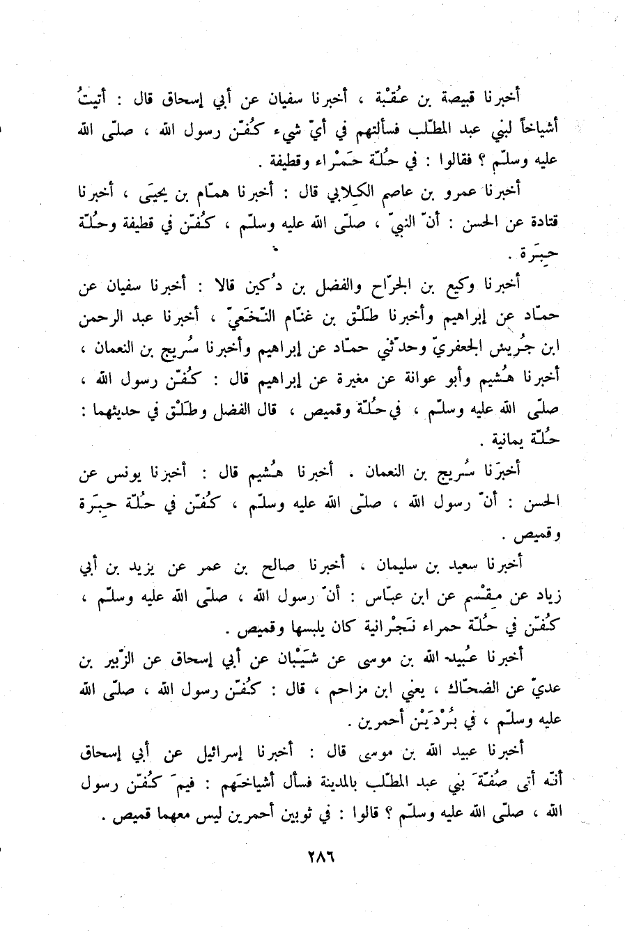 أَخْبَرَنَا قَبِيصَةُ بْنُ عُقْبَةَ، أَخْبَرَنَا سُفْيَانُ، عَنْ أَبِي إِسْحَاقَ، قَالَ: أَتَيْتُ أَشْيَاخًا لِبَنِي عَبْدِ الْمُطَّلِبِ، فَسَأَلْتُهُمْ: §فِي أَيِّ شَيْءٍ كُفِّنَ رَسُولُ اللَّهِ صلّى الله عليه وسلم؟، فَقَالُوا: فِي حُلَّةٍ حَمْرَاءَ وَقَطِيفَةٍ "