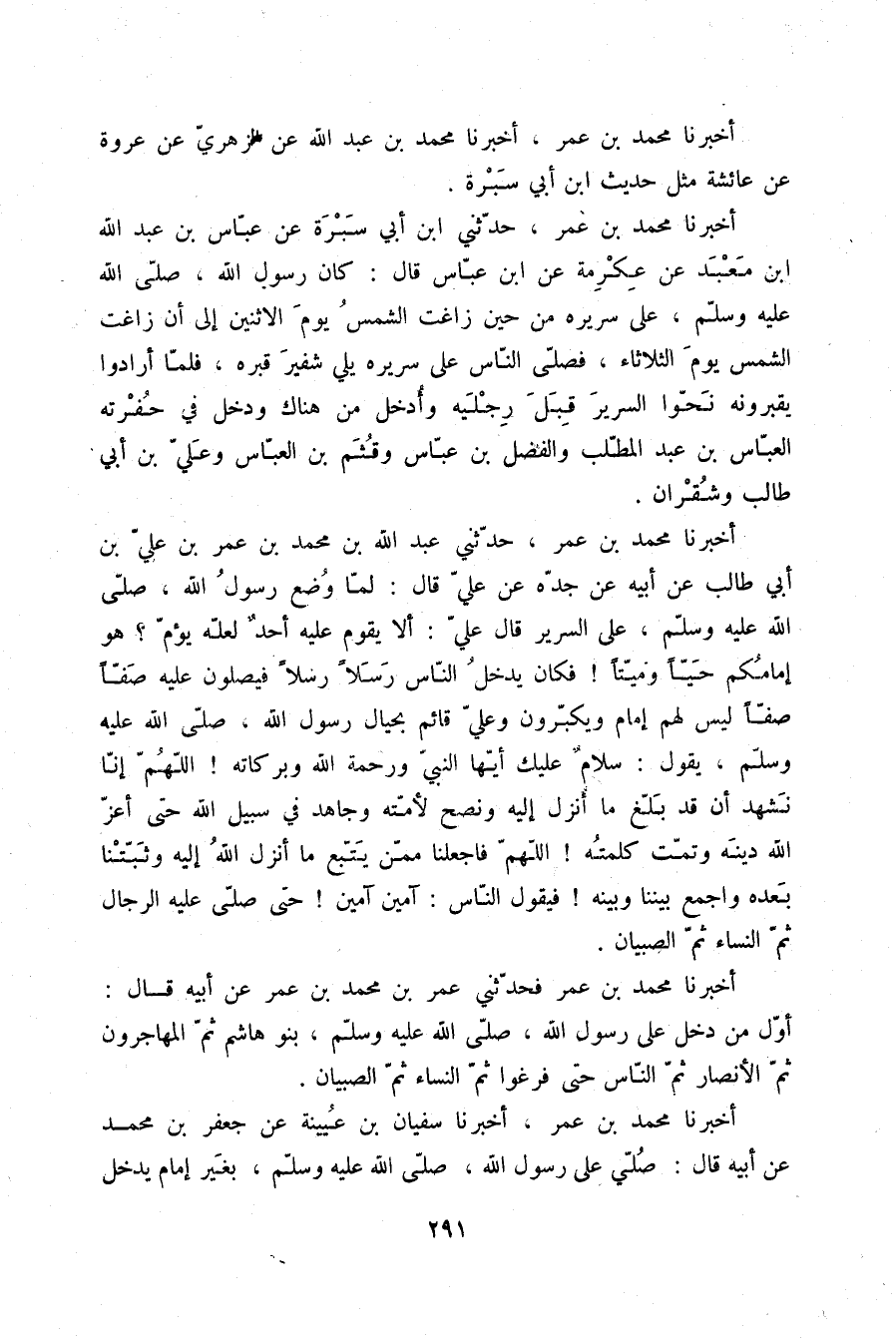 أَخْبَرَنَا مُحَمَّدُ بْنُ عُمَرَ، حَدَّثَنِي عَبْدُ اللَّهِ بْنُ مُحَمَّدِ بْنِ عُمَرَ بْنِ عَلِيِّ بْنِ أَبِي طَالِبٍ، عَنْ أَبِيهِ، عَنْ جَدِّهِ، عَنْ عَلِيٍّ، قَالَ: " لَمَّا وُضِعَ رَسُولُ اللَّهِ صلّى الله عليه وسلم عَلَى السَّرِيرِ قَالَ عَلِيُّ: §أَلَا يَقُومُ عَلَيْهِ أَحَدٌ لَعَلَّهُ يَؤُمَّ؟ هُوَ إِمَامِكُمْ حَيًّا وَمَيِّتًا فَكَانَ يَدْخُلُ النَّاسُ رَسَلًا رَسَلًا فَيُصَلُّونَ عَلَيْهِ صَفًّا صَفًّا، لَيْسَ لَهُمْ إِمَامٌ، وَيُكَبِّرُونَ، وَعَلِيٌّ قَائِمٌ بِحِيَالِ رَسُولِ اللَّهِ صلّى الله عليه وسلم يَقُولُ: سَلَامٌ عَلَيْكَ أَيُّهَا النَّبِيُّ وَرَحْمَةُ اللَّهِ وَبَرَكَاتُهُ اللَّهُمَّ إنا نَشْهَدُ أَنْ قَدْ بَلَّغَ مَا أُنْزِلَ إِلَيْهِ، وَنَصَحَ لِأُمَّتِهِ، وَجَاهَدَ فِي سَبِيلِ اللَّهِ حَتَّى أَعَزَّ اللَّهُ دِينَهُ، وَتَمَّتْ كَلِمَتُهُ اللَّهُمَّ فَاجْعَلْنَا مِمَّنْ يَتَّبِعُ مَا أَنْزَلَ اللَّهُ إِلَيْهِ، وَثَبِّتْنَا بَعْدَهُ، وَاجْمَعْ بَيْنَنَا وَبَيْنَهُ فَيَقُولُ النَّاسُ: آمِينَ آمِينَ حَتَّى صَلَّى عَلَيْهِ الرِّجَالُ، ثُمَّ النِّسَاءُ، ثُمَّ الصِّبْيَانُ "
