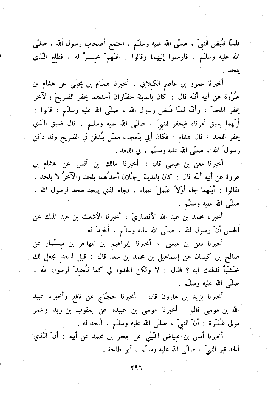 أَخْبَرَنَا أَنَسُ بْنُ عِيَاضٍ اللَّيْثِيُّ، عَنْ جَعْفَرِ بْنِ مُحَمَّدٍ، عَنْ أَبِيهِ: «أَنَّ §الَّذِي أَلْحَدَ قَبْرَ النَّبِيِّ صلّى الله عليه وسلم أَبُو طَلْحَةَ»