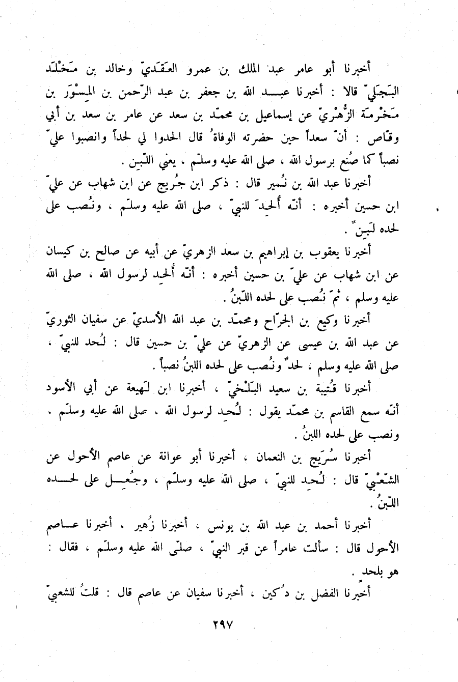 أَخْبَرَنَا قُتَيْبَةُ بْنُ سَعِيدٍ الْبَلْخِيُّ، أَخْبَرَنَا ابْنُ لَهِيعَةَ، عَنْ أَبِي الْأَسْوَدِ، أَنَّهُ سَمِعَ الْقَاسِمَ بْنَ مُحَمَّدٍ، يَقُولُ: «§لُحِدَ لِرَسُولِ اللَّهِ صلّى الله عليه وسلم، وَنُصِبَ عَلَى لَحْدِهِ اللَّبِنُ»