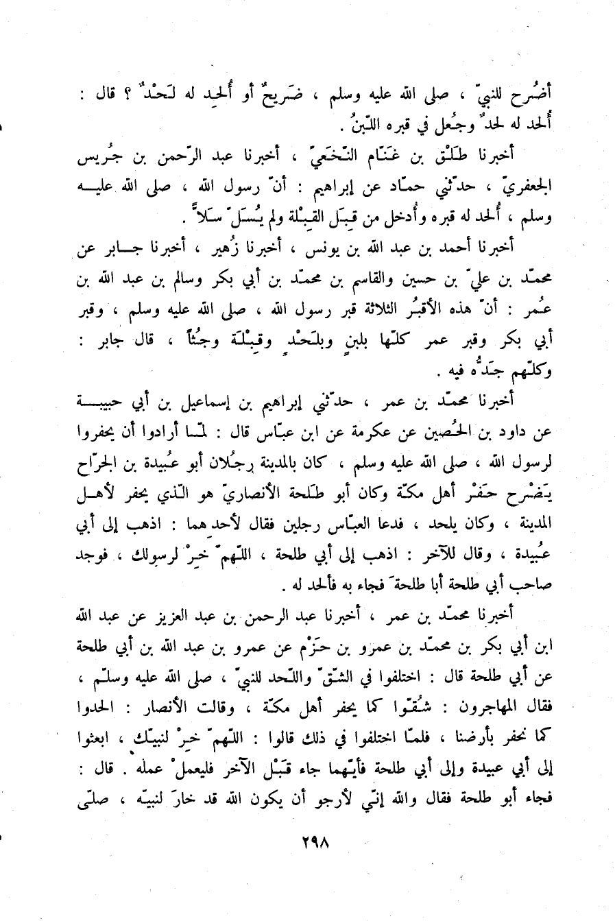 أَخْبَرَنَا مُحَمَّدُ بْنُ عُمَرَ، أَخْبَرَنَا عَبْدُ الرَّحْمَنِ بْنُ عَبْدِ الْعَزِيزِ، عَنْ عَبْدِ اللَّهِ بْنِ أَبِي بَكْرِ بْنِ مُحَمَّدِ بْنِ عَمْرِو بْنِ حَزْمٍ، عَنْ عَمْرِو بْنِ عَبْدِ اللَّهِ بْنِ أَبِي طَلْحَةَ، عَنْ أَبِي طَلْحَةَ، قَالَ: " اخْتَلَفُوا فِي الشَّقِّ وَاللَّحْدِ لِلنَّبِيِّ صلّى الله عليه وسلم، فَقَالَ: الْمُهَاجِرُونَ: شُقُّوا كَمَا يَحْفِرُ أَهْلُ مَكَّةَ , وَقَالَتِ الْأَنْصَارُ: الْحَدُوا كَمَا نَحْفِرُ بِأَرْضِنَا , فَلَمَّا اخْتَلَفُوا فِي ذَلِكَ قَالُوا: " §اللَّهُمَّ خِرْ لِنَبِيِّكَ , ابْعَثُوا إِلَى أَبِي عُبَيْدَةَ وَإِلَى أَبِي طَلْحَةَ فَأَيُّهُمَا جَاءَ قَبْلَ الْآخَرِ فَلْيَعْمَلْ عَمَلَهُ. قَالَ: فَجَاءَ أَبُو طَلْحَةَ فَقَالَ: وَاللَّهِ إِنِّي لَأَرْجُو أَنْ يَكُونَ اللَّهُ قَدْ خَارَ لِنَبِيِّهِ -[299]- صلّى الله عليه وسلم، إِنَّهُ كَانَ يَرَى اللَّحْدَ فَيُعْجِبَهُ "