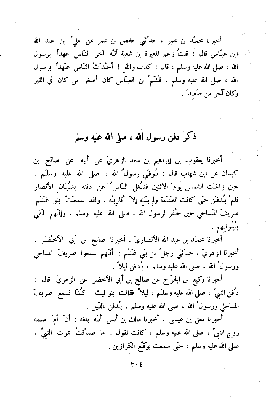 أَخْبَرَنَا يَعْقُوبُ بْنُ إِبْرَاهِيمَ بْنِ سَعْدٍ الزُّهْرِيُّ، عَنْ أَبِيهِ، عَنْ صَالِحِ بْنِ كَيْسَانَ، عَنِ ابْنِ شِهَابٍ، قَالَ: «§تُوُفِّيَ رَسُولُ اللَّهِ صلّى الله عليه وسلم حِينَ زَاغَتِ الشَّمْسُ يَوْمَ الِاثْنَيْنِ، فَشُغِلَ النَّاسُ عَنْ دَفْنِهِ بِشُبَّانِ الْأَنْصَارِ، فَلَمْ يُدْفَنْ حَتَّى كَانَتِ الْعَتَمَةُ، وَلَمْ يَلِهِ إِلَّا أَقَارِبُهُ , وَلَقَدْ سَمِعَتْ بَنُو غَنْمٍ صَرِيفَ الْمَسَاحِي حِينَ حُفِرَ لِرَسُولِ اللَّهِ صلّى الله عليه وسلم وَإِنَّهُمْ لَفِي بُيُوتِهِمْ»