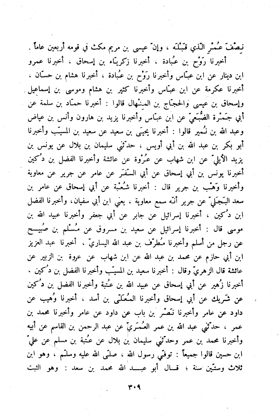 أَخْبَرَنَا رَوْحُ بْنُ عُبَادَةَ، أَخْبَرَنَا زَكَرِيَّاءُ بْنُ إِسْحَاقَ، أَخْبَرَنَا عَمْرُو بْنُ دِينَارٍ، عَنِ ابْنِ عَبَّاسٍ، وَأَخْبَرَنَا رَوْحُ بْنُ عُبَادَةَ، أَخْبَرَنَا هِشَامُ بْنُ حَسَّانَ، أَخْبَرَنَا عِكْرِمَةُ، عَنِ ابْنِ عَبَّاسٍ، وَأَخْبَرَنَا كَثِيرُ بْنُ هِشَامٍ، وَمُوسَى بْنُ إِسْمَاعِيلَ، وَإِسْحَاقُ بْنُ عِيسَى، وَالْحَجَّاجُ بْنُ الْمِنْهَالِ، قَالُوا: أَخْبَرَنَا حَمَّادُ بْنُ سَلَمَةَ، عَنْ أَبِي جَمْرَةَ الضُّبَعِيِّ، عَنِ ابْنِ عَبَّاسٍ، وَأَخْبَرَنَا يَزِيدُ بْنُ هَارُونَ، وَأَنَسُ بْنُ عِيَاضٍ، وَعَبْدُ اللَّهِ بْنُ نُمَيْرٍ، قَالُوا: أَخْبَرَنَا يَحْيَى بْنُ سَعِيدٍ، عَنْ سَعِيدِ بْنِ الْمُسَيِّبِ، وَأَخْبَرَنَا أَبُو بَكْرِ بْنُ عَبْدِ اللَّهِ بْنِ أَبِي أُوَيْسٍ، حَدَّثَنِي سُلَيْمَانُ بْنُ بِلَالٍ، عَنْ يُونُسَ بْنِ يَزِيدَ الْأَيْلِيِّ، عَنِ ابْنِ شِهَابٍ، عَنْ عُرْوَةَ، عَنْ عَائِشَةَ، وَأَخْبَرَنَا الْفَضْلُ بْنُ دُكَيْنٍ، أَخْبَرَنَا يُونُسُ بْنُ أَبِي إِسْحَاقَ، عَنْ أَبِي السَّفَرِ، عَنْ عَامِرٍ، عَنْ جَرِيرٍ، عَنْ مُعَاوِيَةَ، وَأَخْبَرَنَا وَهْبُ بْنُ جَرِيرٍ، قَالَ: أَخْبَرَنَا شُعْبَةُ، عَنْ أَبِي إِسْحَاقَ، عَنْ عَامِرِ بْنِ سَعْدٍ الْبَجَلِيِّ، عَنْ جَرِيرٍ، أَنَّهُ سَمِعَ مُعَاوِيَةَ يَعْنِي ابْنَ أَبِي سُفْيَانَ، وَأَخْبَرَنَا الْفَضْلُ بْنُ دُكَيْنٍ، أَخْبَرَنَا إِسْرَائِيلُ، عَنْ جَابِرٍ، عَنْ أَبِي جَعْفَرٍ، وَأَخْبَرَنَا عُبَيْدُ اللَّهِ بْنُ مُوسَى، قَالَ: أَخْبَرَنَا إِسْرَائِيلُ، عَنْ سَعِيدِ بْنِ مَسْرُوقٍ، عَنْ مُسْلِمِ بْنِ صُبَيْحٍ، عَنْ رَجُلٍ مِنْ أَسْلَمَ , وَأَخْبَرَنَا مُطَرِّفُ بْنُ عَبْدِ اللَّهِ الْيَسَارِيُّ، أَخْبَرَنَا عَبْدُ الْعَزِيزِ بْنُ أَبِي حَازِمٍ، عَنْ مُحَمَّدِ بْنِ عَبْدِ اللَّهِ، عَنِ ابْنِ شِهَابٍ، عَنْ عُرْوَةَ بْنِ الزُّبَيْرِ، عَنْ عَائِشَةَ، قَالَ الزُّهْرِيُّ: وَقَالَ: أَخْبَرَنَا سَعِيدُ بْنُ الْمُسَيِّبِ، وَأَخْبَرَنَا الْفَضْلُ بْنُ دُكَيْنٍ، أَخْبَرَنَا زُهَيْرٌ، عَنْ أَبِي إِسْحَاقَ، عَنْ عُبَيْدِ اللَّهِ بْنِ عُتْبَةَ، وَأَخْبَرَنَا الْفَضْلُ بْنُ دُكَيْنٍ، عَنْ شَرِيكٍ، عَنْ أَبِي إِسْحَاقَ، وَأَخْبَرَنَا الْمُعَلَّى بْنُ أَسَدٍ، أَخْبَرَنَا وُهَيْبٌ، عَنْ دَاوُدَ، عَنْ عَامِرٍ، وَأَخْبَرَنَا نَصْرُ بْنُ بَابٍ، عَنْ دَاوُدَ، عَنْ عَامِرٍ، وَأَخْبَرَنَا مُحَمَّدُ بْنُ عُمَرَ، حَدَّثَنِي عَبْدُ اللَّهِ بْنُ عُمَرَ الْعُمَرِيُّ، عَنْ عَبْدِ الرَّحْمَنِ بْنِ الْقَاسِمِ، عَنْ أَبِيهِ، وَأَخْبَرَنَا مُحَمَّدُ بْنُ عُمَرَ، وَحَدَّثَنِي سُلَيْمَانُ بْنُ بِلَالٍ، عَنْ عُتْبَةَ بْنِ مُسْلِمٍ، عَنْ عَلِيِّ بْنِ حُسَيْنٍ، قَالُوا جَمِيعًا: «§تُوُفِّيَ رَسُولُ اللَّهِ صلّى الله عليه وسلم وَهُوَ ابْنُ ثَلَاثٍ وَسِتِّينَ سَنَةً» . قَالَ أَبُو عَبْدِ اللَّهِ مُحَمَّدُ بْنُ سَعْدٍ: وَهُوَ الثَّبَتُ -[310]- إِنْ شَاءَ اللَّهُ