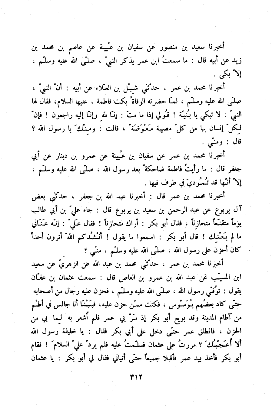 أَخْبَرَنَا مُحَمَّدُ بْنُ عُمَرَ، حَدَّثَنِي مُحَمَّدُ بْنُ عَبْدِ اللَّهِ، عَنِ الزُّهْرِيِّ، عَنْ سَعِيدِ بْنِ الْمُسَيِّبِ، عَنْ عَبْدِ اللَّهِ بْنِ عَمْرِو بْنِ الْعَاصِ، قَالَ: سَمِعْتُ عُثْمَانَ بْنَ عَفَّانَ، يَقُولُ: " تُوُفِّيَ رَسُولُ اللَّهِ صلّى الله عليه وسلم فَحَزِنَ عَلَيْهِ رِجَالٌ مِنْ أَصْحَابِهِ حَتَّى كَادَ بَعْضُهُمْ يُوَسْوِسُ , فَكُنْتُ مِمَّنْ حَزِنَ عَلَيْهِ , فَبَيْنَا أَنَا جَالِسٌ فِي أُطُمٍ مِنْ آطَامِ الْمَدِينَةِ وَقَدْ بُويِعَ أَبُو بَكْرٍ إِذْ مَرَّ بِي عُمَرُ فَلَمْ أَشْعُرْ بِهِ لِمَا بِي مِنَ الْحُزْنِ , فَانْطَلَقَ عُمَرُ حَتَّى دَخَلَ عَلَى أَبِي بَكْرٍ فَقَالَ: يَا خَلِيفَةَ رَسُولِ اللَّهِ أَلَا أُعَجِّبُكَ؟ مَرَرْتُ عَلَى عُثْمَانَ فَسَلَّمْتُ عَلَيْهِ فَلَمْ يَرُدَّ عَلَيَّ السَّلَامَ فَقَامَ أَبُو بَكْرٍ فَأَخَذَ بِيَدِ عُمَرَ فَأَقْبَلَا جَمِيعًا حَتَّى أَتَيَانِي فَقَالَ لِي أَبُو بَكْرٍ: يَا عُثْمَانُ -[313]-، جَاءَنِي أَخُوكَ فَزَعَمَ أَنَّهُ مَرَّ بِكَ فَسَلَّمَ عَلَيْكَ فَلَمْ تُرَدَّ عَلَيْهِ , فَمَا الَّذِي حَمَلَكَ عَلَى ذَلِكَ؟ فَقُلْتُ: يَا خَلِيفَةَ رَسُولِ اللَّهِ، مَا فَعَلْتُ فَقَالَ عُمَرُ: بَلَى وَاللَّهِ وَلَكِنَّهَا عُبِّيَّتُكُمْ يَا بَنِي أُمَيَّةَ فَقُلْتُ: وَاللَّهِ مَا شَعَرْتُ أَنَّكَ مَرَرْتَ بِي وَلَا سَلَّمْتَ عَلَيَّ فَقَالَ أَبُو بَكْرٍ: صَدَقْتَ , أَرَاكَ وَاللَّهِ شُغِلْتَ عَنْ ذَلِكَ بِأَمْرٍ حَدَّثْتَ بِهِ نَفْسَكَ قَالَ: فَقُلْتُ: أَجَلْ قَالَ: فَمَا هُوَ؟ فَقُلْتُ: تُوُفِّيَ رَسُولُ اللَّهِ صلّى الله عليه وسلم وَلَمْ أَسْأَلْهُ عَنْ نَجَاةِ هَذِهِ الْأُمَّةِ مَا هُوَ , وَكُنْتُ أُحَدِّثُ بِذَلِكَ نَفْسِي وَأَعْجَبُ مِنْ تَفْرِيطِي فِي ذَلِكَ؛ فَقَالَ أَبُو بَكْرٍ: قَدْ سَأَلْتُهُ عَنْ ذَلِكَ فَأَخْبَرَنِي بِهِ. فَقَالَ عُثْمَانُ: مَا هُوَ؟ قَالَ أَبُو بَكْرٍ: سَأَلْتُهُ فَقُلْتُ: يَا رَسُولَ اللَّهِ مَا نَجَاةُ هَذِهِ الْأُمَّةِ؟ فَقَالَ: «§مَنْ قَبِلَ مِنِّي الْكَلِمَةَ الَّتِي عَرَضْتُهَا عَلَى عَمِّي فَرَدَّهَا عَلَيَّ فَهِيَ لَهُ نَجَاةٌ» ، وَالْكَلِمَةُ الَّتِي عَرْضَهَا عَلَى عَمِّهِ: شَهَادَةُ أَنْ لَا إِلَهَ إِلَّا اللَّهُ، وَأَنَّ مُحَمَّدًا أَرْسَلَهُ اللَّهُ