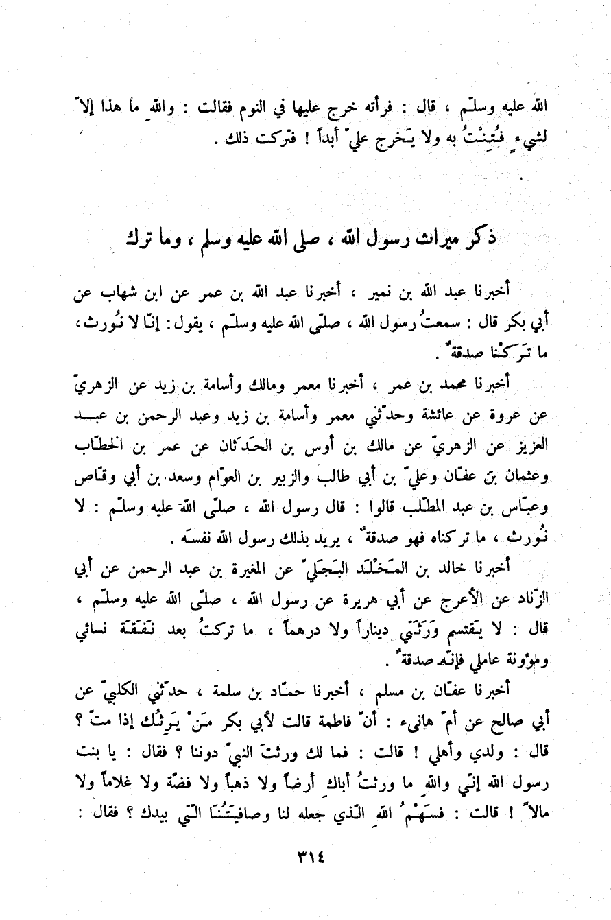 أَخْبَرَنَا عَبْدُ اللَّهِ بْنُ نُمَيْرٍ، أَخْبَرَنَا عَبْدُ اللَّهِ بْنُ عُمَرَ , عَنِ ابْنِ شِهَابٍ، عَنْ أَبِي بَكْرٍ، قَالَ: سَمِعْتُ رَسُولَ اللَّهِ صلّى الله عليه وسلم يَقُولُ: «§إِنَّا لَا نُورَثُ , مَا تَرَكْنَا صَدَقَةٌ»