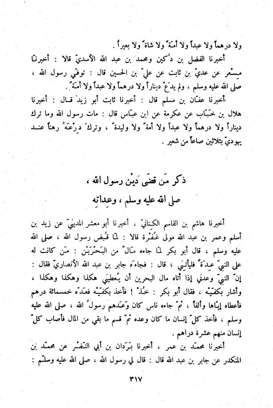 أَخْبَرَنَا الْفَضْلُ بْنُ دُكَيْنٍ، وَمُحَمَّدُ بْنُ عَبْدِ اللَّهِ الْأَسَدِيُّ، قَالَا: أَخْبَرَنَا مِسْعَرٌ، عَنْ عَدِيِّ بْنِ ثَابِتٍ، عَنْ عَلِيِّ بْنِ الْحُسَيْنِ، قَالَ: «§تُوُفِّيَ رَسُولُ اللَّهِ صلّى الله عليه وسلم وَلَمْ يَدَعْ دِينَارًا، وَلَا دِرْهَمًا، وَلَا عَبْدًا، وَلَا أَمَةً»