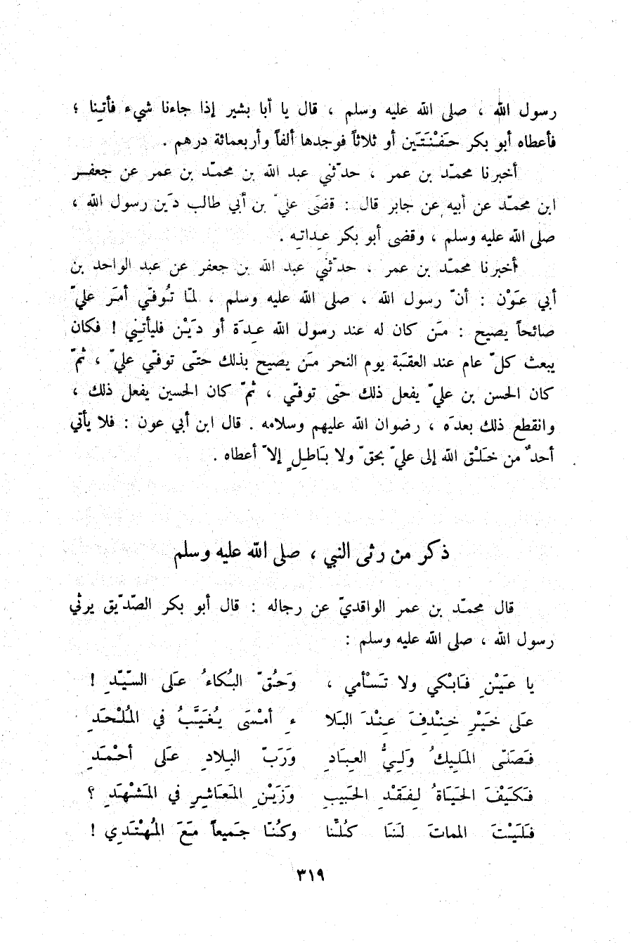 §ذِكْرُ مَنْ رَثَى النَّبِيَّ صلّى الله عليه وسلم قَالَ مُحَمَّدُ بْنُ عُمَرَ الْوَاقِدِيُّ عَنْ رِجَالِهِ: قَالَ أَبُو بَكْرٍ الصِّدِّيقُ يَرْثِي رَسُولَ اللَّهِ صلّى الله عليه وسلم: