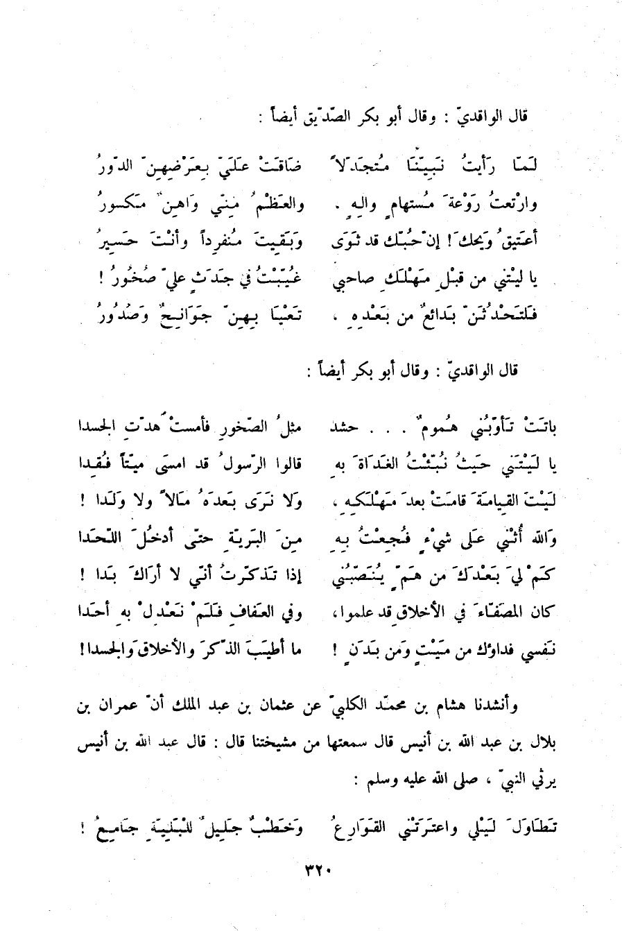 وَأَنْشَدَنَا هِشَامُ بْنُ مُحَمَّدٍ الْكَلْبِيُّ , عَنْ عُثْمَانَ بْنِ عَبْدِ الْمَلِكِ، أَنَّ عِمْرَانَ بْنَ بِلَالِ بْنِ عَبْدِ اللَّهِ بْنِ أُنَيْسٍ، قَالَ: سَمِعْتُهَا مِنْ مَشْيَخَتِنَا قَالَ: قَالَ عَبْدُ اللَّهِ بْنُ أُنَيْسٍ يَرْثِي النَّبِيَّ صلّى الله عليه وسلم:
