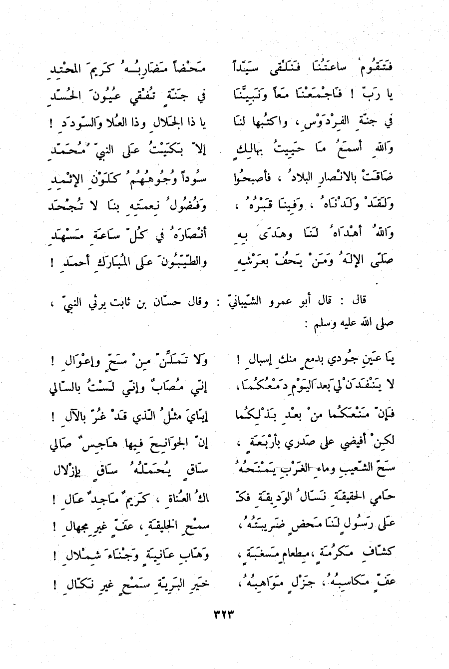 صَلَّى الْإِلَهُ وَمَنْ يَحُفُّ بِعَرْشِهِ وَالطَّيِّبُونَ عَلَى الْمُبَارَكِ أَحْمَدِ قَالَ: قَالَ أَبُو عَمْرٍو الشَّيْبَانِيُّ: وَقَالَ حَسَّانُ بْنُ ثَابِتٍ يَرْثِي النَّبِيَّ صلّى الله عليه وسلم:
