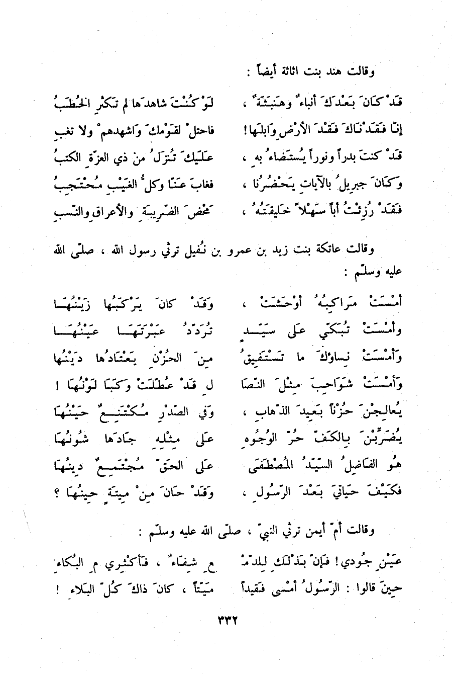 فَقَدْ رُزِئْتُ أَبًا سَهْلًا خَلِيقَتُهُ مَحْضَ الضَّرِيبَةِ وَالْأَعْرَاقِ وَالنَّسَبِ وَقَالَتْ عَاتِكَةُ بِنْتُ زَيْدِ بْنِ عَمْرِو بْنِ نُفَيْلٍ تَرْثِي رَسُولَ اللَّهِ صلّى الله عليه وسلم: