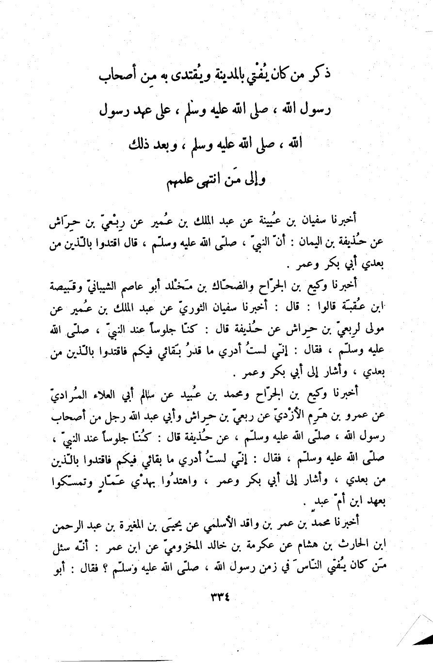 أَخْبَرَنَا وَكِيعُ بْنُ الْجَرَّاحِ، وَالضَّحَّاكُ بْنُ مَخْلَدٍ أَبُو عَاصِمٍ الشَّيْبَانِيُّ، وَقَبِيصَةُ بْنُ عُقْبَةَ، قَالُوا: قَالَ: أَخْبَرَنَا سُفْيَانُ الثَّوْرِيُّ، عَنْ عَبْدِ الْمَلِكِ بْنِ عُمَيْرٍ، عَنْ مَوْلَى لِرِبْعِيِّ بْنِ حِرَاشٍ، عَنْ حُذَيْفَةَ، قَالَ: كُنَّا جُلُوسًا عِنْدَ النَّبِيِّ صلّى الله عليه وسلم فَقَالَ: «§إِنِّي لَسْتُ أَدْرِي مَا قَدْرُ بَقَائِي فِيكُمْ فَاقْتَدُوا بِاللَّذَيْنِ مِنْ بَعْدِي» ، وَأَشَارَ إِلَى أَبِي بَكْرٍ، وَعُمَرَ "
